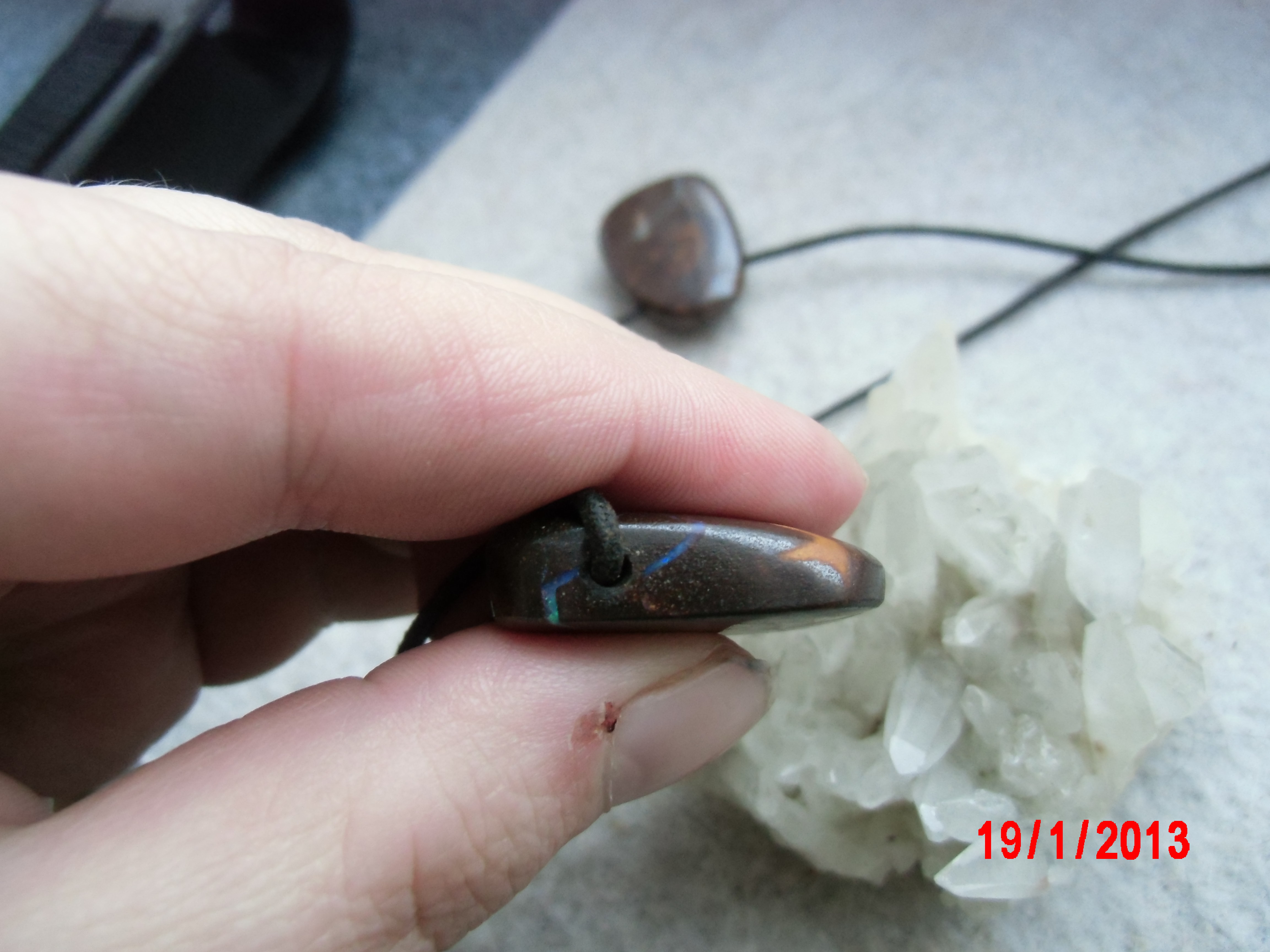 hatte wie ich mich damals hier angemeldet hatte meinen ersten Boulder gezeigt, ja ich weiß Bilder unscharf lag an meiner veralteten Kamera. Nun fand ja im Dezember noch ein Boulder den Weg zu mir als ich auf dieser Messe in Berlin war. Und seither kommt es mir so vor als würde diese neue Boulder meine anderen beiden -wie soll ich das am besten ausdrücken ... ihre Lebenskräfte aktivert zu haben-. Seit kurzen wollen sie auch lieber auf meine Bergkristallstufe liegen. Bei meinem ersten Boulder wurde die Zeichnung wieder deutlicher und innerhalb der schwarzen Linien bilden sich kleine schwarze Punkte hatte ich ganz zu anfang auch schon mal bei diesem Exemplar an einer anderen Stelle. Diese schwarzen Punkte wurden dann zu einem blauen Schimmer. Selbst der zweite der bekommt anscheinend seine Farbe wieder und das grüne schimmert wieder kräftiger. Und der dritte als der neueste bekommt auch langsam Farbe ins Gesicht. Trage sie derzeit nur Abends weil ich tagsüber andere trage.