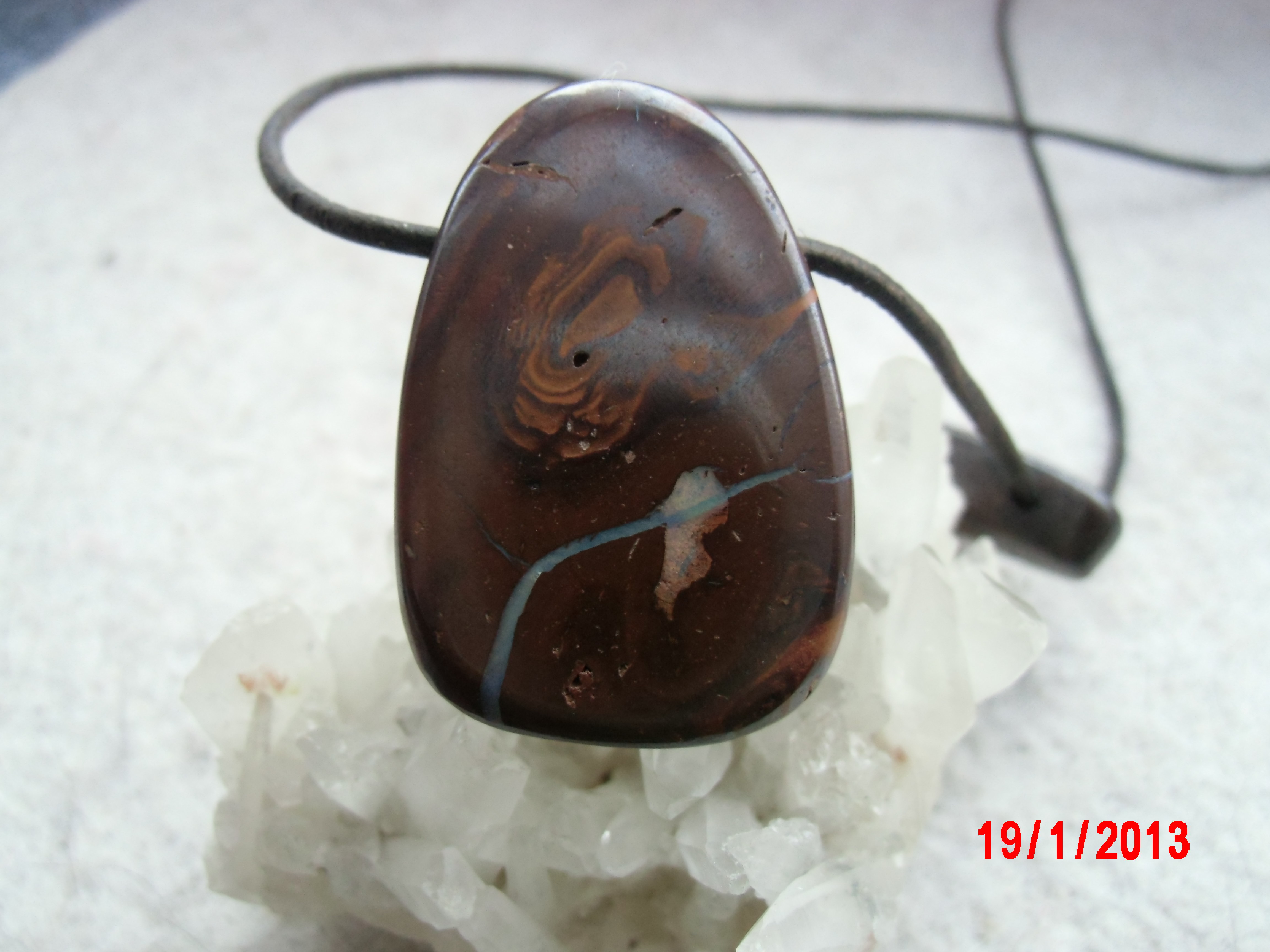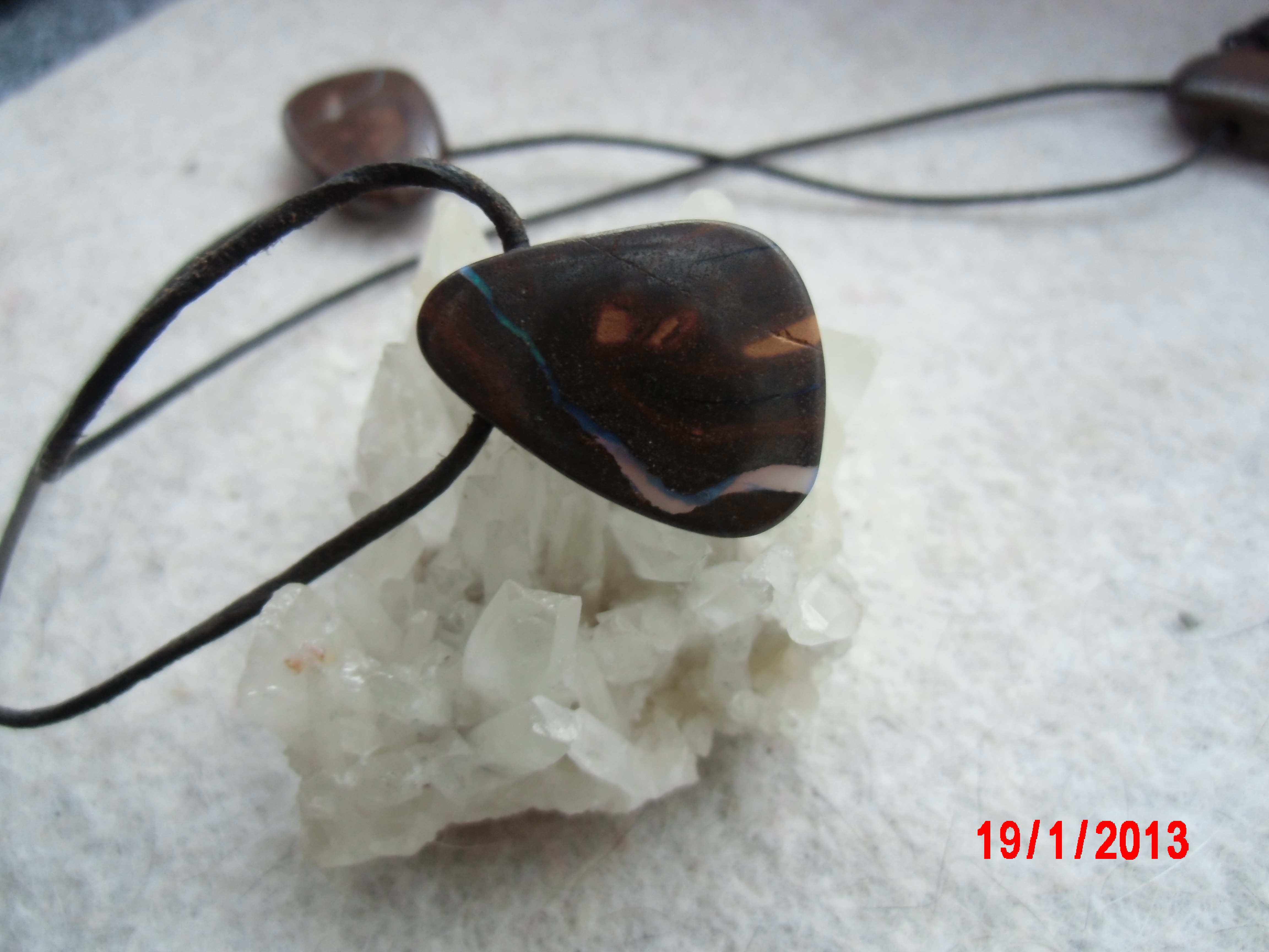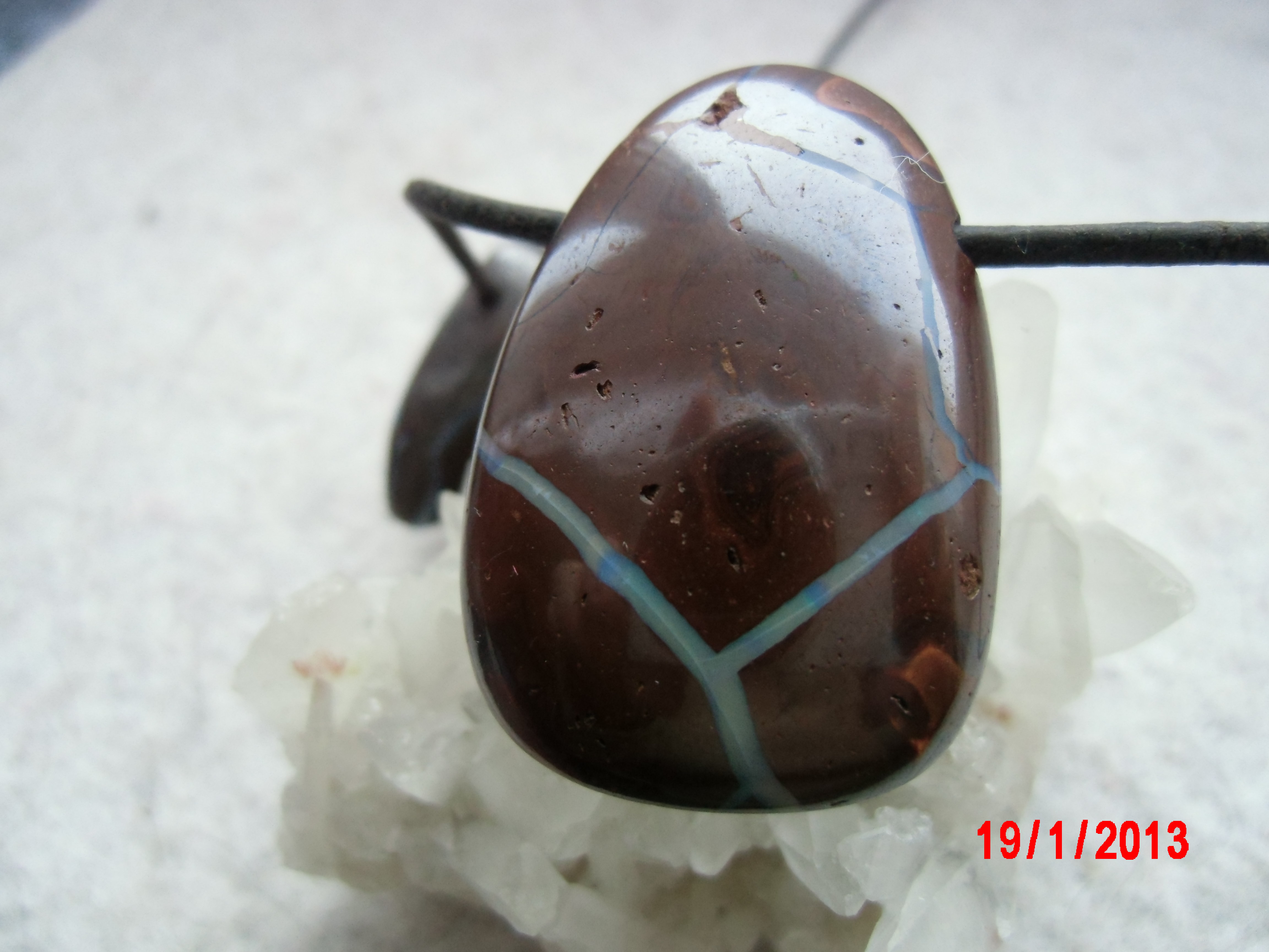 hatte wie ich mich damals hier angemeldet hatte meinen ersten Boulder gezeigt, ja ich weiß Bilder unscharf lag an meiner veralteten Kamera. Nun fand ja im Dezember noch ein Boulder den Weg zu mir als ich auf dieser Messe in Berlin war. Und seither kommt es mir so vor als würde diese neue Boulder meine anderen beiden -wie soll ich das am besten ausdrücken ... ihre Lebenskräfte aktivert zu haben-. Seit kurzen wollen sie auch lieber auf meine Bergkristallstufe liegen. Bei meinem ersten Boulder wurde die Zeichnung wieder deutlicher und innerhalb der schwarzen Linien bilden sich kleine schwarze Punkte hatte ich ganz zu anfang auch schon mal bei diesem Exemplar an einer anderen Stelle. Diese schwarzen Punkte wurden dann zu einem blauen Schimmer. Selbst der zweite der bekommt anscheinend seine Farbe wieder und das grüne schimmert wieder kräftiger. Und der dritte als der neueste bekommt auch langsam Farbe ins Gesicht. Trage sie derzeit nur Abends weil ich tagsüber andere trage.