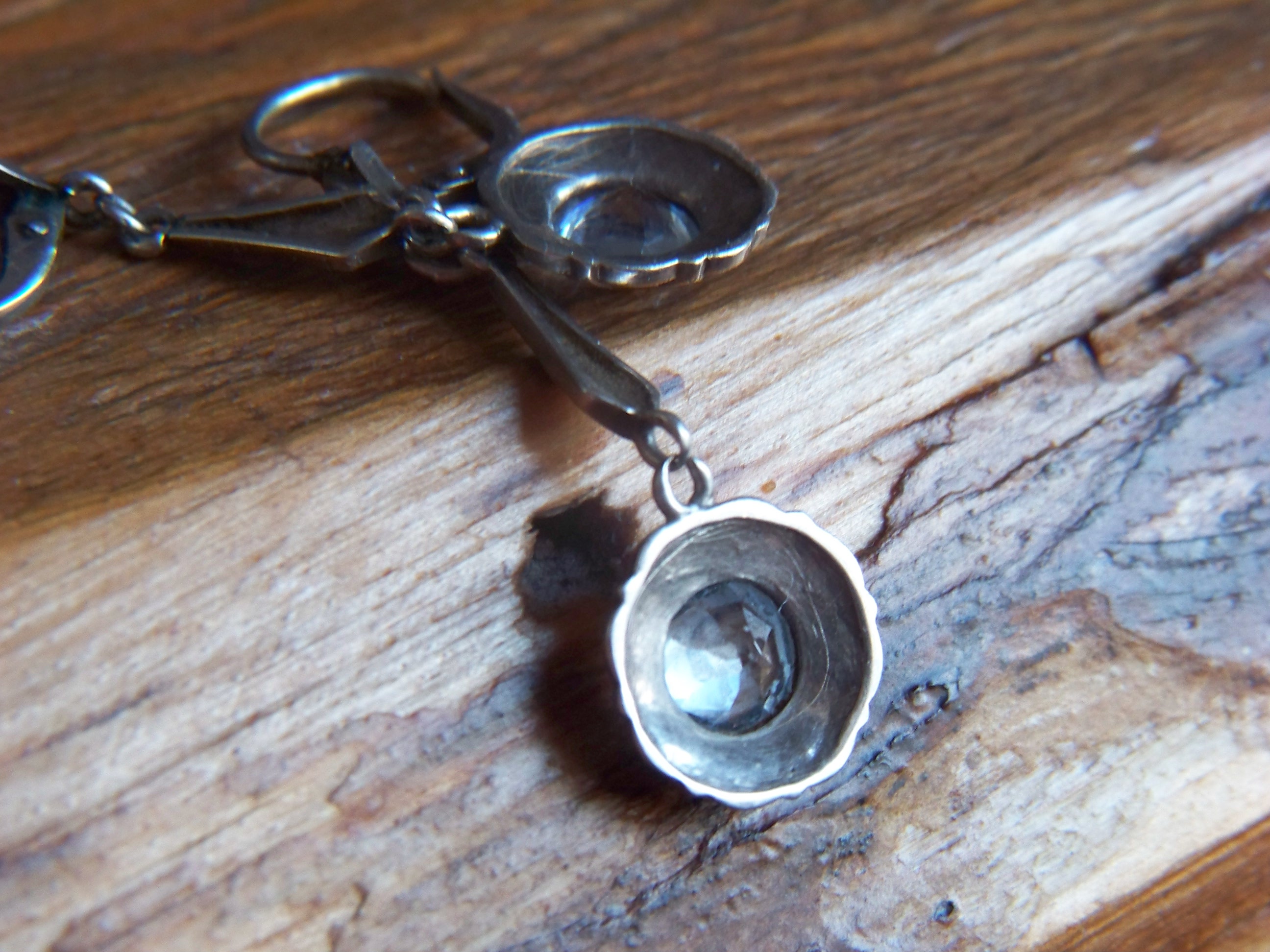 von der machart könnten die ohrringe aus der zeit des art deco sein, also im zeitraum zwischen 1920 - 1940 - falls es keine nachbildungen aus dieser zeit sind. in dieser zeit wurde in solchen stücken mitunter auch synthetischer spinell u. blautopas verarbeitet.