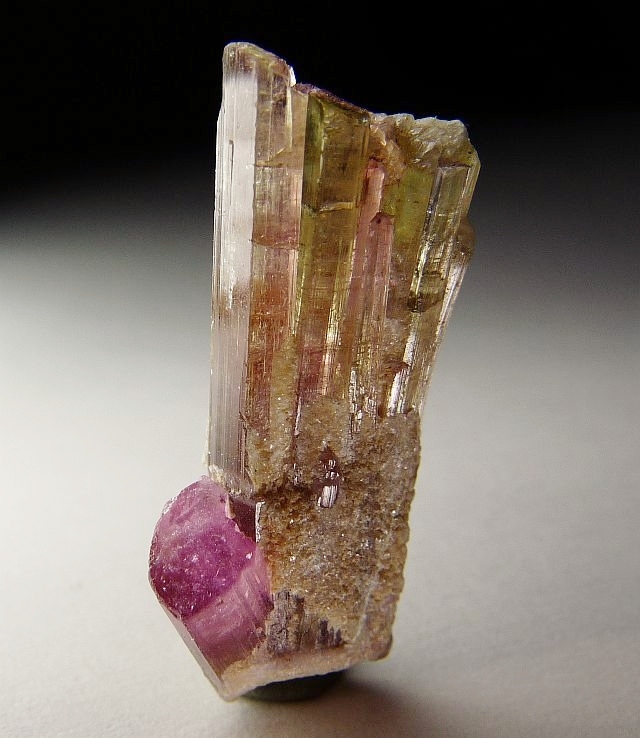 bei der zweiten kristallgruppe handelt es sich bei den turmalinen um elbaite - aus rubelith und verdelith. die kristalle, die seitlich aufgewachsen sind kann ich nicht erkennen.