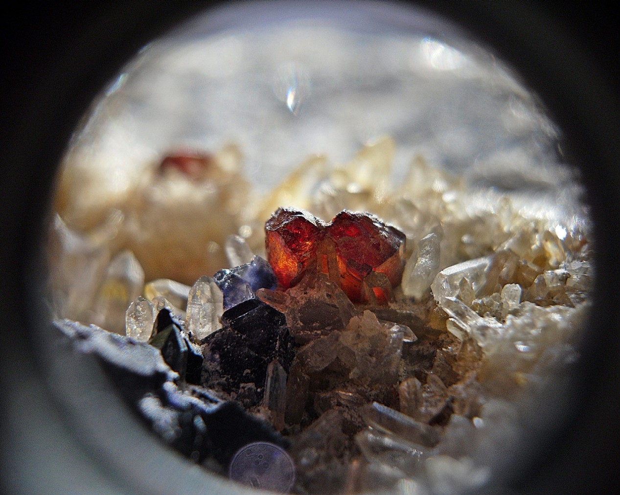 einige winzige rubinblende-kristalle, die zwischen quarz u. fluorit auf einer granitstufe gewachsen sind. fundort: henneberg, thüringen