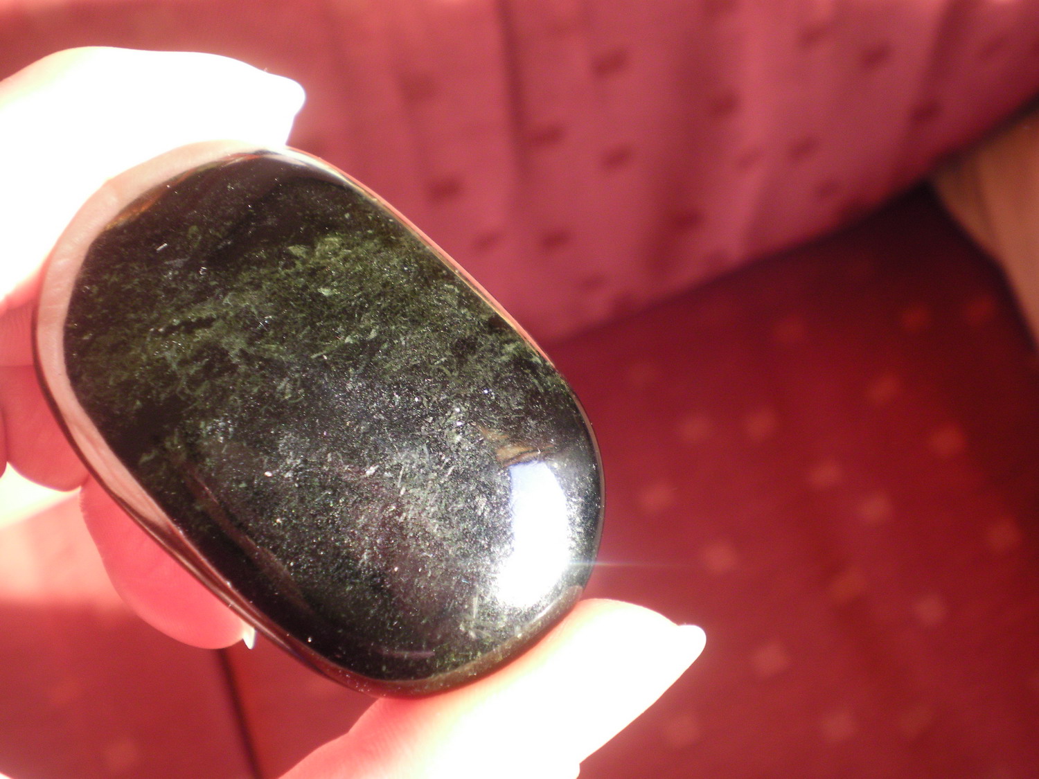 Er hat nur einen ganz leichten Schimmer, den ich zuerst für golden gehalten habe, aber als ich den Stein fotografierte, sah der Schimmer eher grün aus. :-?