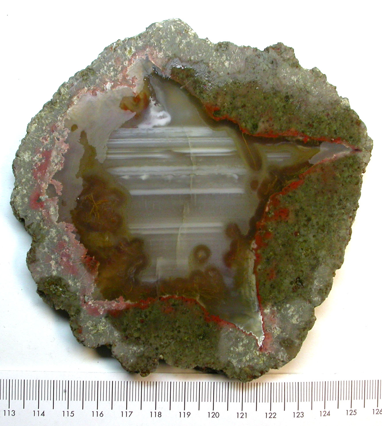 Wir können wiederum sehr schön die Ausbildung eines Achaten mit zwei Kristallisationszyklen erkennen. Fangen wir diesmal "innen" an: