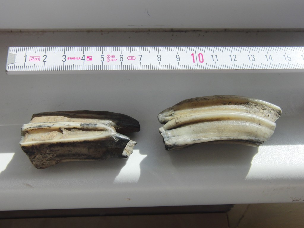Die beiden Zähne sind entweder vom Ur-Pferd oder Ur-Rind.