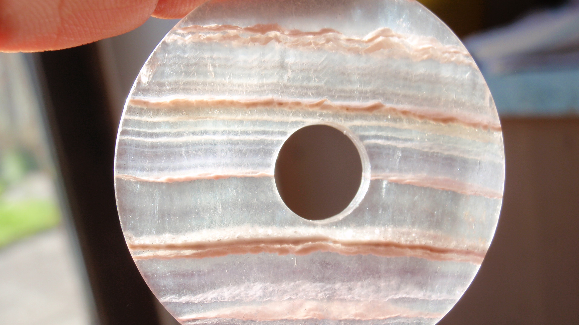 Ja, an Fluorit habe ich auch schon gedacht, aber er sieht bis auf die bräunlichen Streifen sehr farblos aus. Die oberen Bänder sehen wie Wolken aus. Eines der unteren Bänder sieht aus, als ob sich klitzekleine Sandkörner abgelagert hätten!