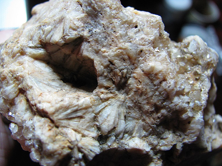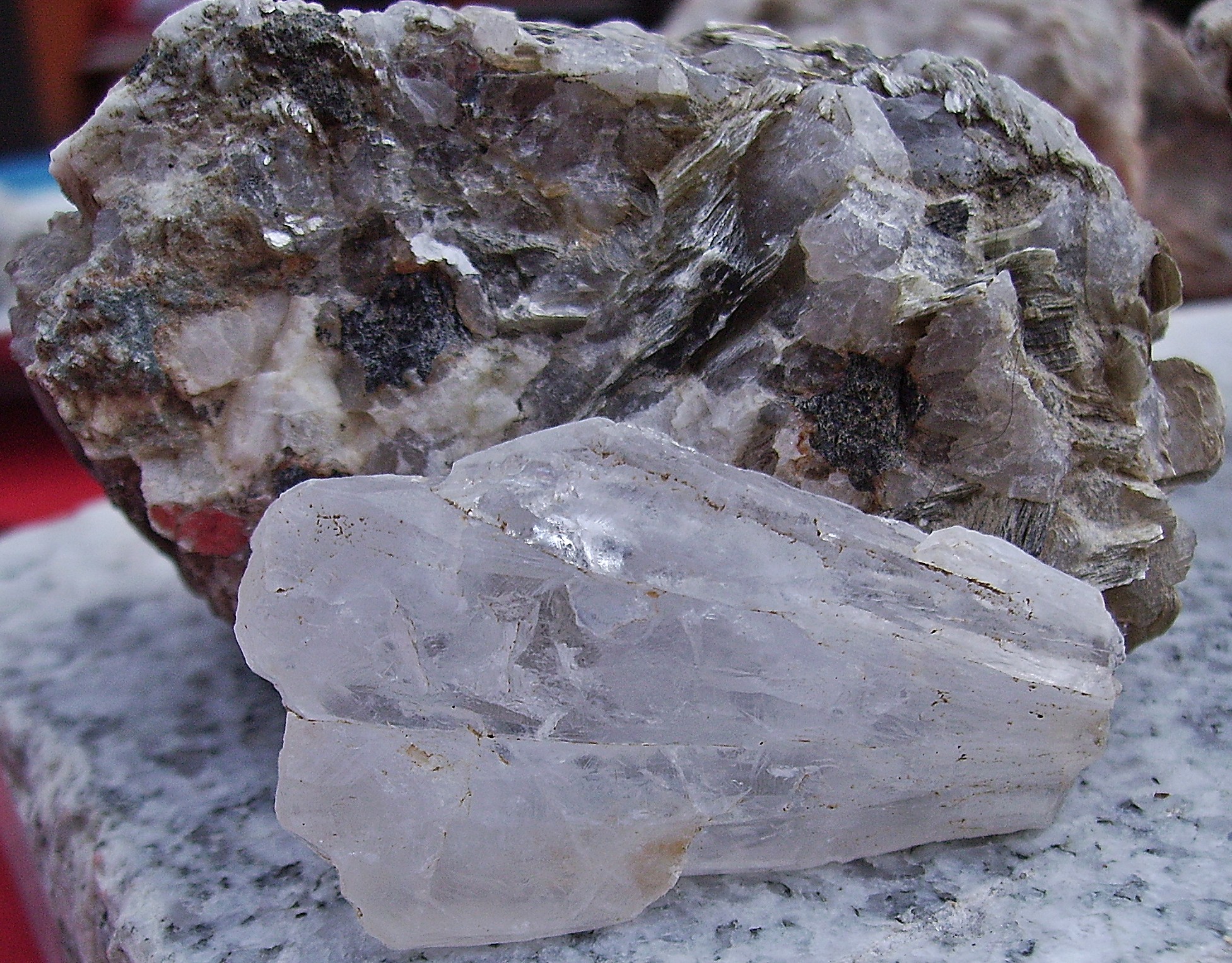 Stück grosser Sternquarz, dahinter Rätselstein, vermutlich Randgranit mit viel Muskovit + evtl. Turmalin