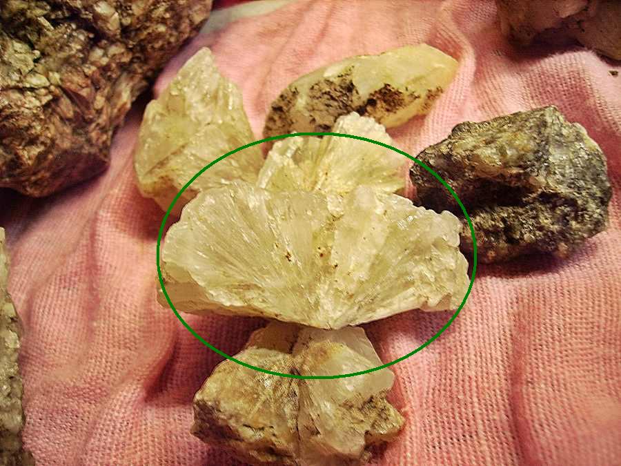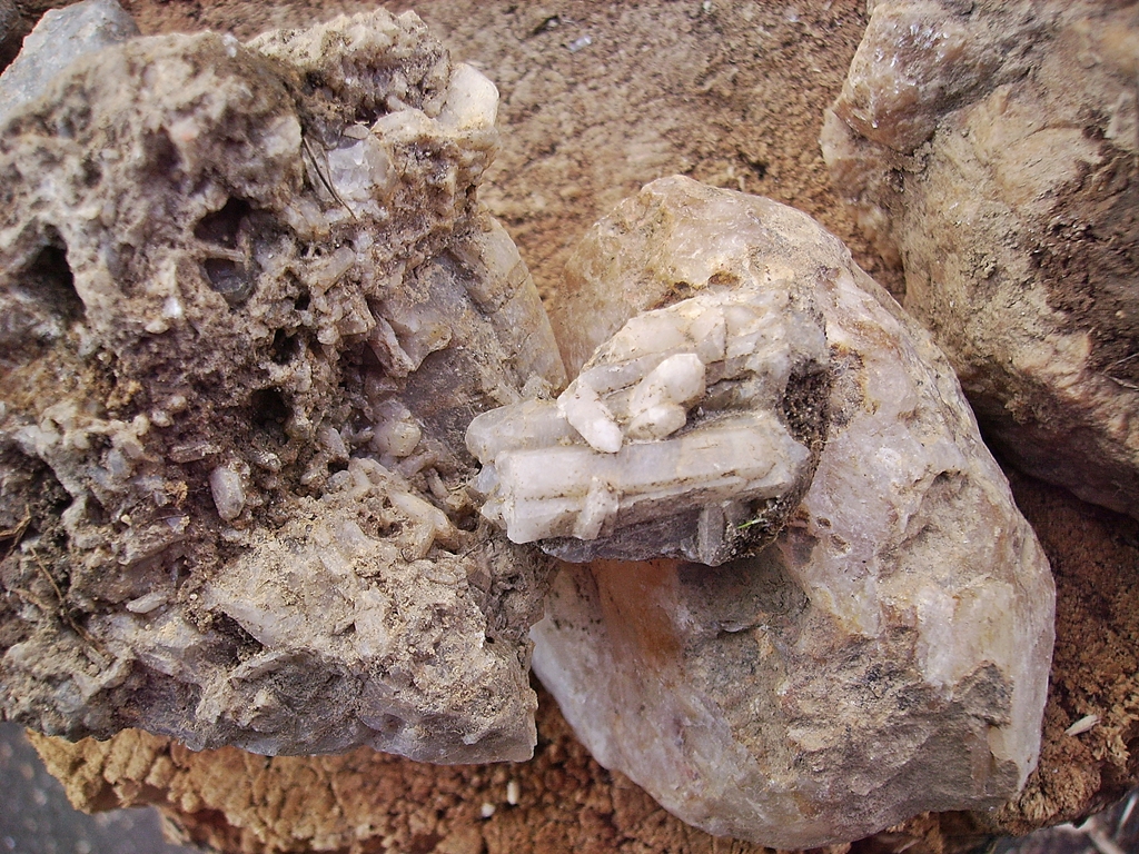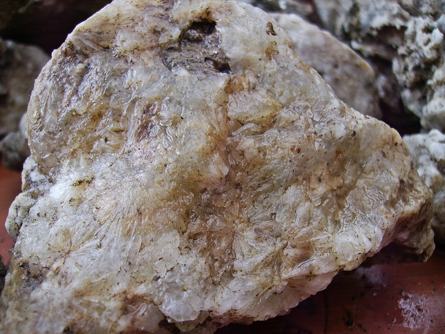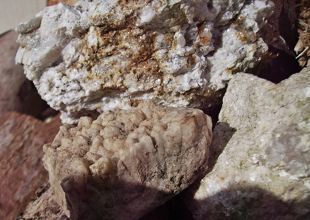 Stück grosser Sternquarz, dahinter Rätselstein, vermutlich  Randgranit mit viel Muskovit + evtl. Turmalin
