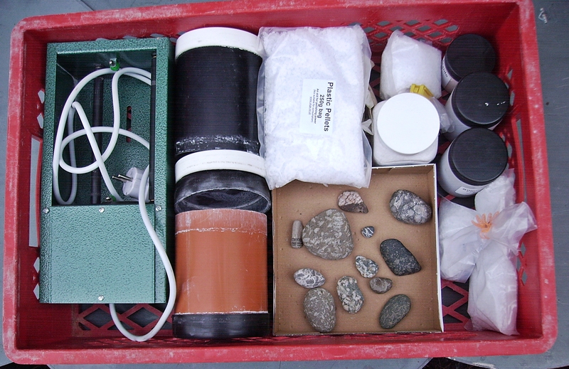 Eine Maschine mit der man Steine trommeln kann sowie jede Menge Schleif-und Poliermittel