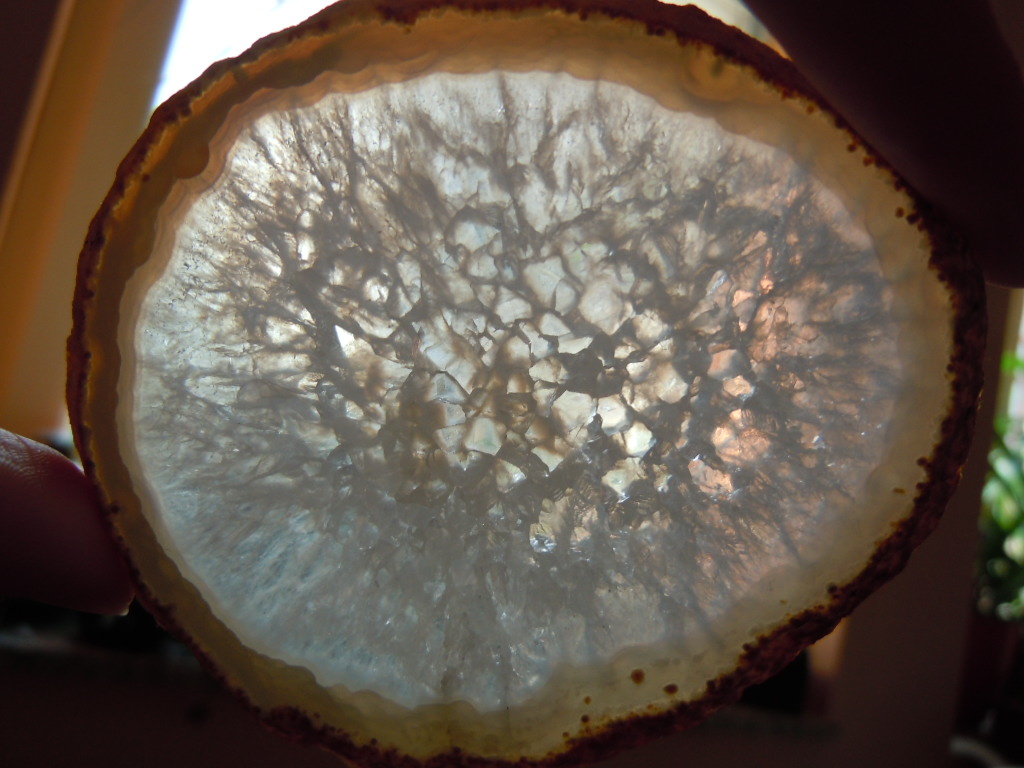 Achatscheiben mit Bergkristallzentrum helfen alte Ereignisse wieder zu finden und dadurch entstandene Blockaden aufzulösen.