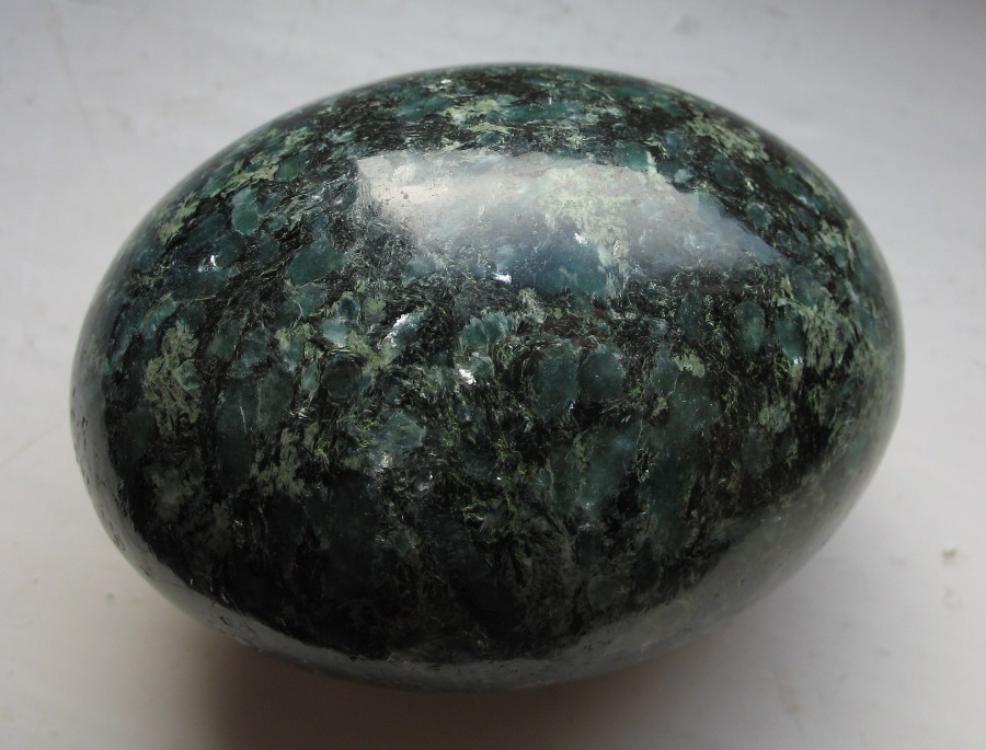 Hm, habe gerade das Foto vom Grünen Disthen in Glimmer mir angesehen, und das sieht dem Ei aber sehr Ähnlich, sollte es doch ein Disthen in Glimmer Ei sein? Kann sich denn ein Großhändler, der schon sehr lange im Geschäft ist, soooo irren? Er hat sein Stück ja immerhin auch als Smaragd in Matrix verkauft. Also, nachdem Monika ja auch geschrieben hat, dass Sie die grünen stellen ritzen konnte, wird es dann wohl doch ein grüner Disthen in Glimmer sein.