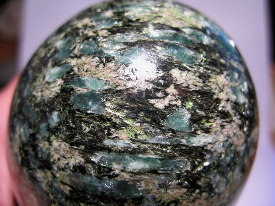 Hier noch mal ein paar Fotos Die blau-grünen Kristalle und das grün-schwarze lassen sich leicht ritzen, das weiße/helle dazwischen ist härter.pezzottait hat geschrieben: Wenn dieses Ei überwiegend aus einem Glimmer besteht, so muss es mit einem Kunstharz stabilisiert worden sein, sonst würde es beim Schleifen zerbröseln. Bei der "Ritzprobe" ist daher unbedingt darauf Rücksicht zu nehmen, denn Kunststoffe sind auch sehr weich (im Vergleich zu den meisten Mineralien). Die Frage richtete sich aber auch nach den blauen Kristallen, die ursprünglich als Disthen interpretiert worden sind. Sind diese blauen Kristalle tatsächlich auch Glimmer in der Aufsicht? Oder sind sie etwas ganz anderes! Vielleicht lässt sich auch davon noch eine Härtebestimmung machen![]()