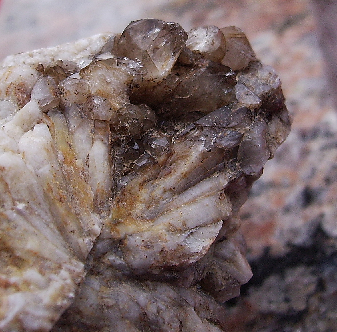 Stück grosser Sternquarz, dahinter Rätselstein, vermutlich  Randgranit mit viel Muskovit + evtl. Turmalin