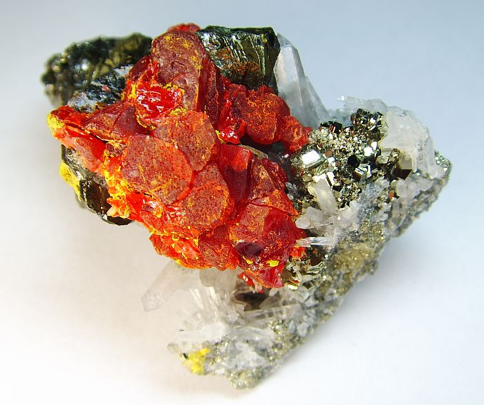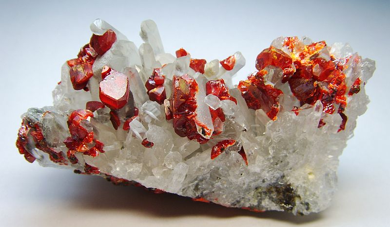 Roter Realgar teils mit gelbem Auripigment auf Bergkristallen oder Quarz Matrix.