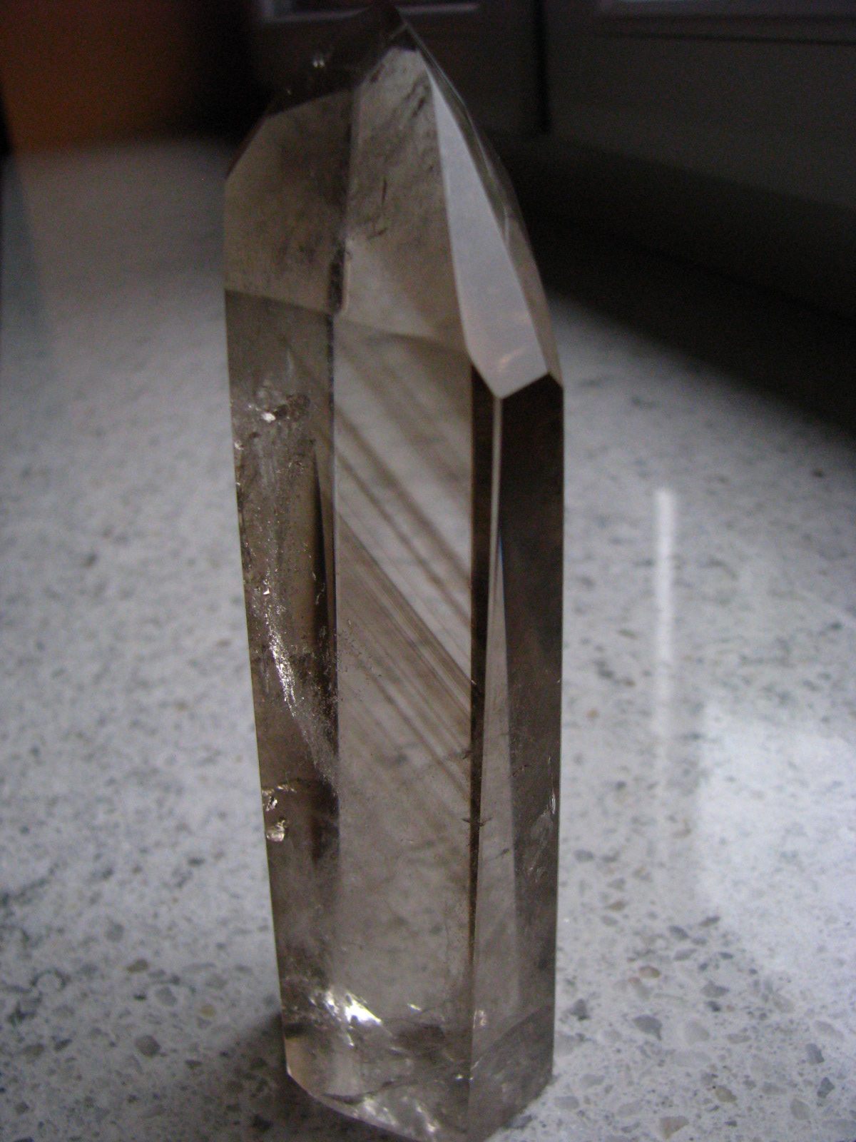 Rauchquarz-anteile und Rutilnadeln. einfach zauberhaft. im gegenlich hat er einfach ganz umwerfende Welten in sich.