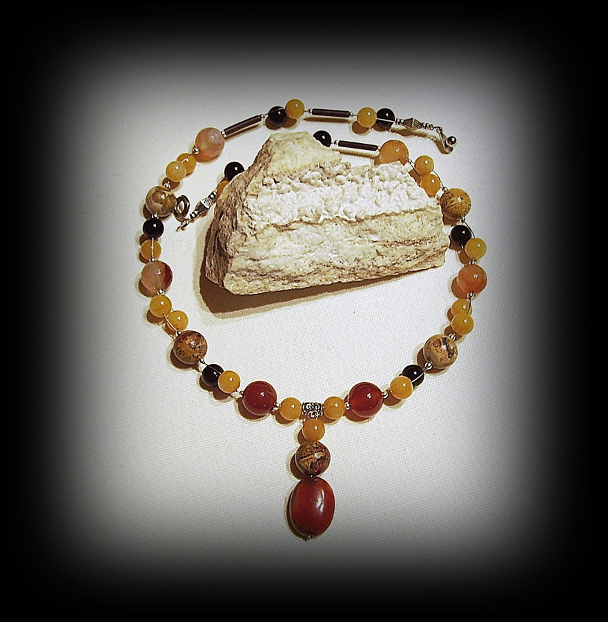 Ich hab für diese Kette wieder mal Reste verkettelt .... Lepardenfell-Jaspis-, Onyx-, Karneol- und unbekannte gelbe Perlen.