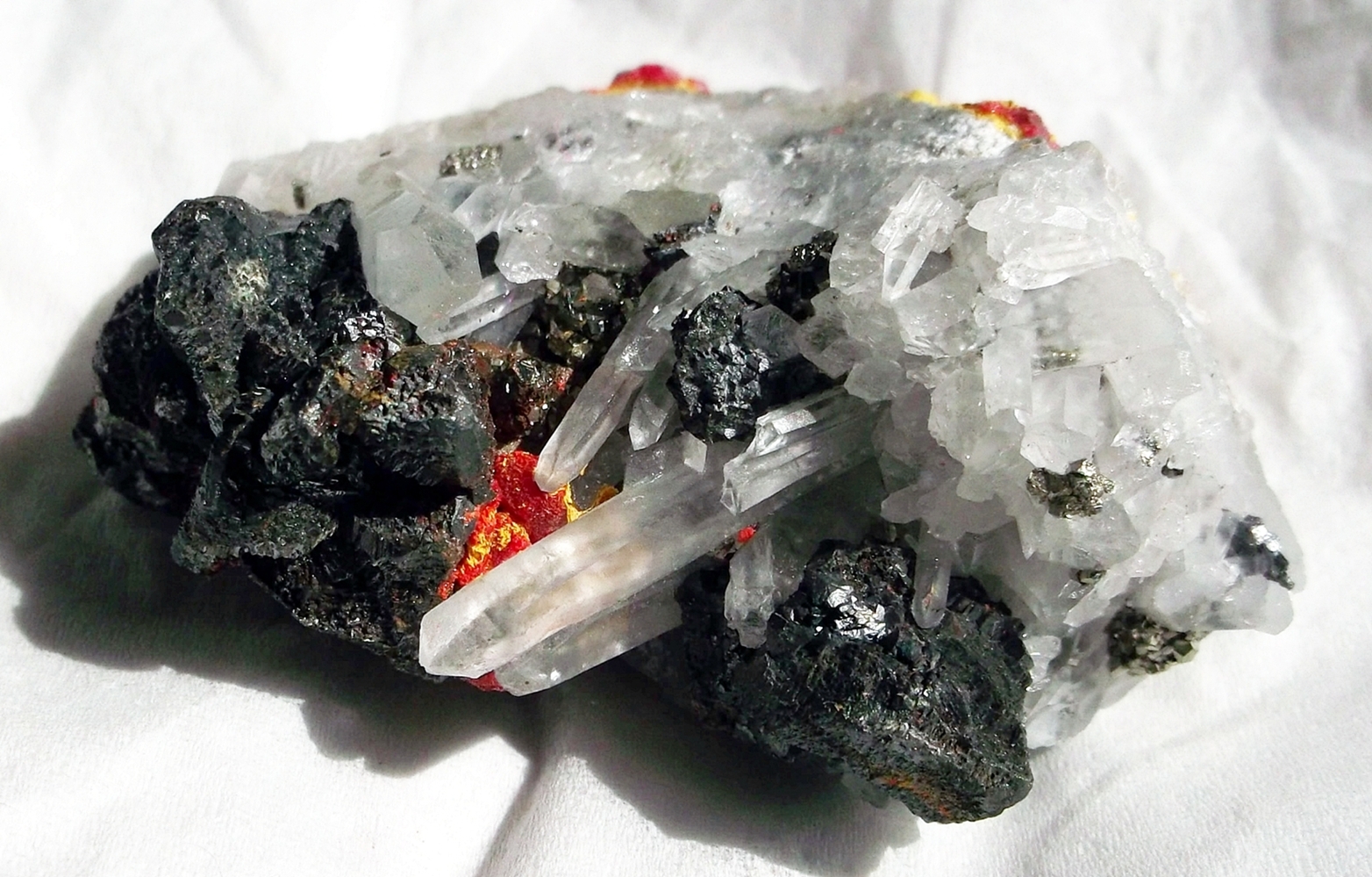 Feuerroter Realgar, gelber Auripigment, weisse Baryt Tafeln und weisser Chalcedon