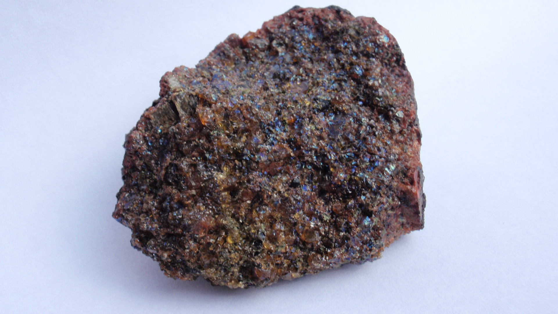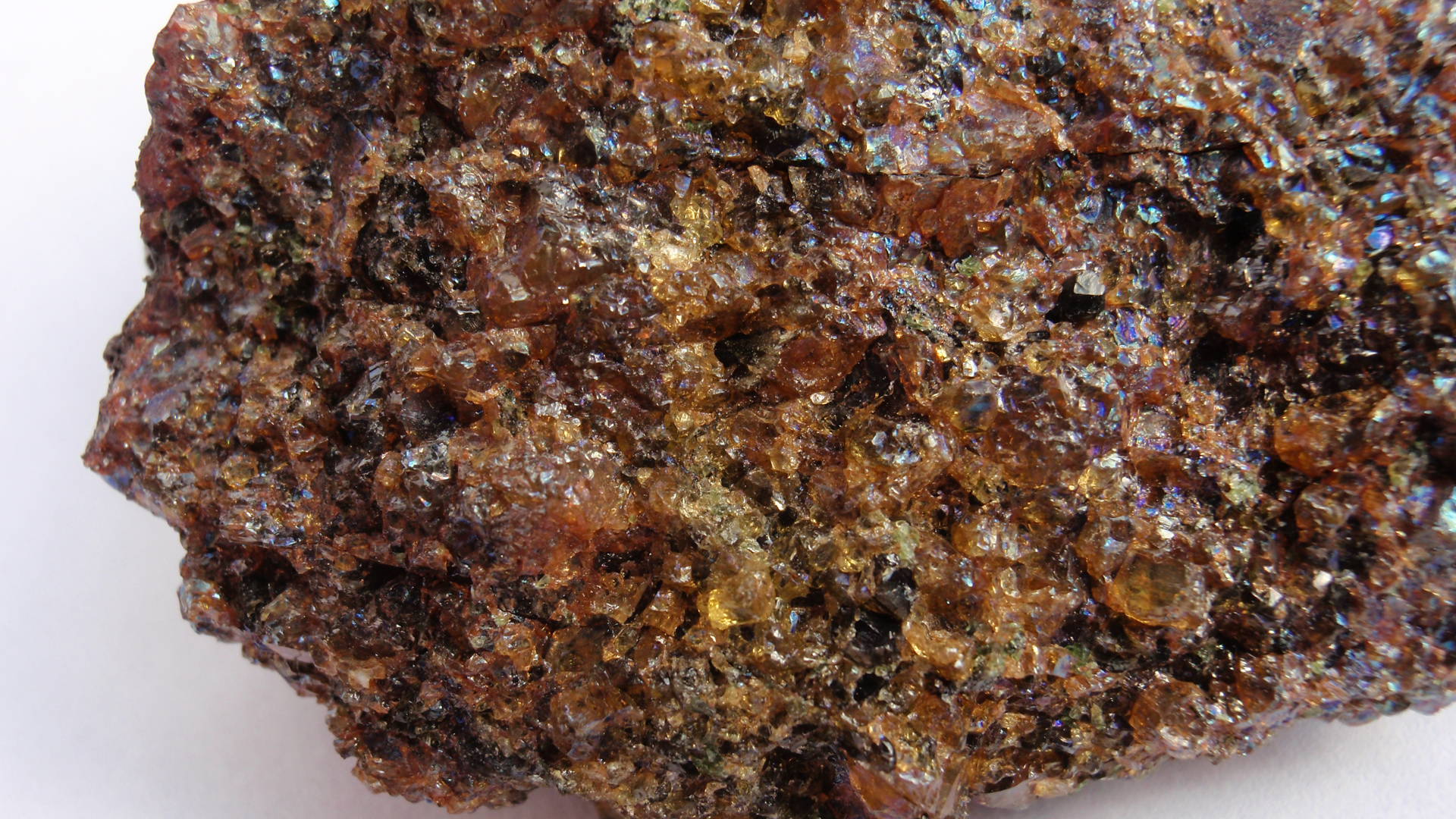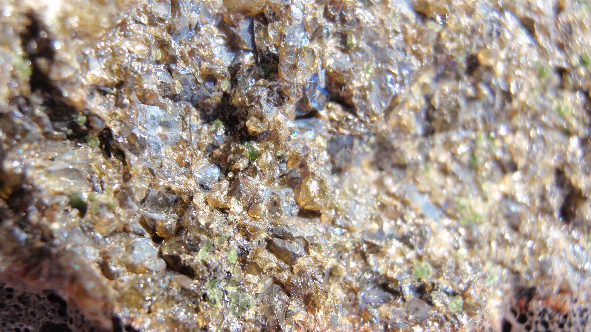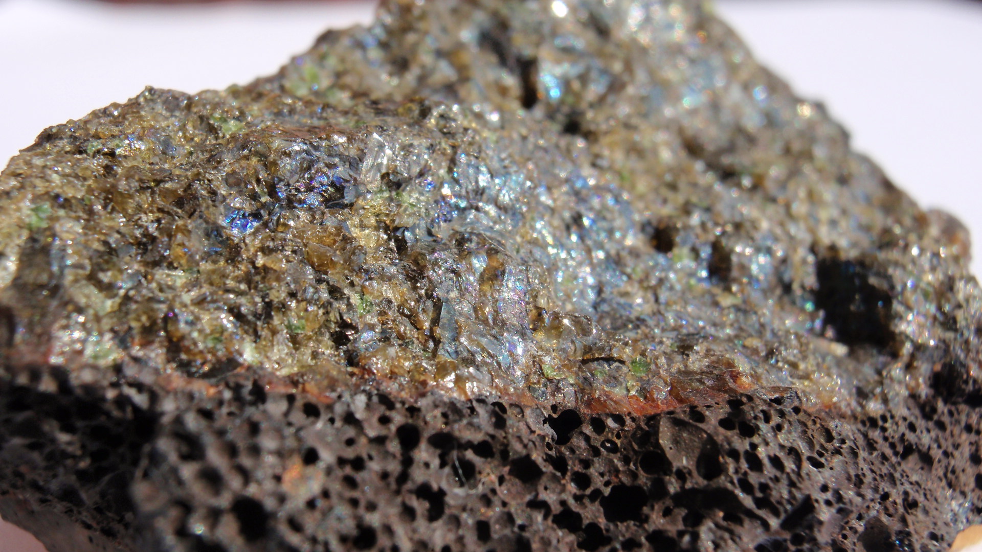 hier zeige ich euch zweimal Lavagestein mit Überzug: braune und grüne Kristalle und durchsichtige, manchmal weiß und blau metallisch schimmernde Kristalle. Zwischen der Lava und den Kristallen ist eine rotbraune Gesteinsschicht. Woraus kann das bestehen - ich vermute mehrere Minerale!