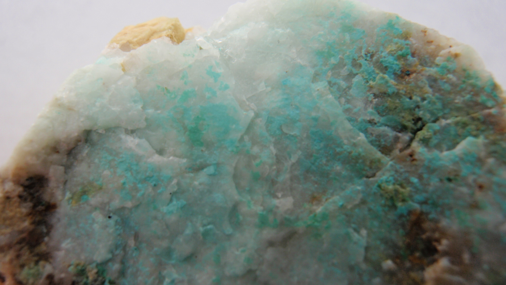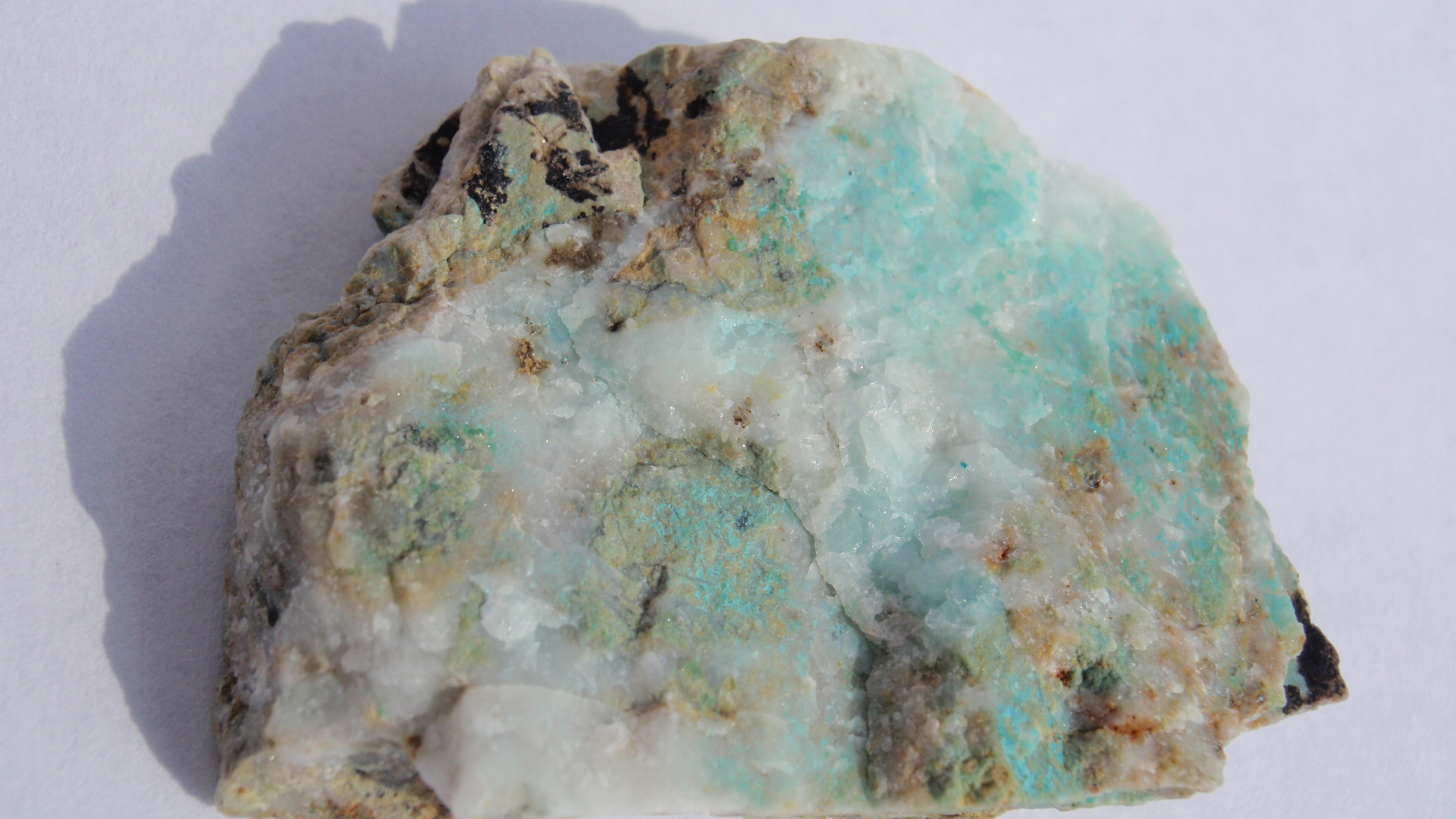 Hier habe ich einen Rohstein, der auf den ersten Blick wie angemalt aussah. Aber beim Fotografieren ist mir ein Stück abgebrochen - er sieht durch und durch gleichfarbig aus. Die Matrix ist wie aus Sedimentschichten aufbebaut. Meine Tendenz - Quarz (weiß) und Chrysokoll?