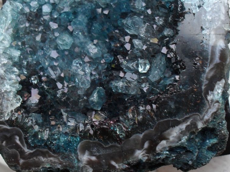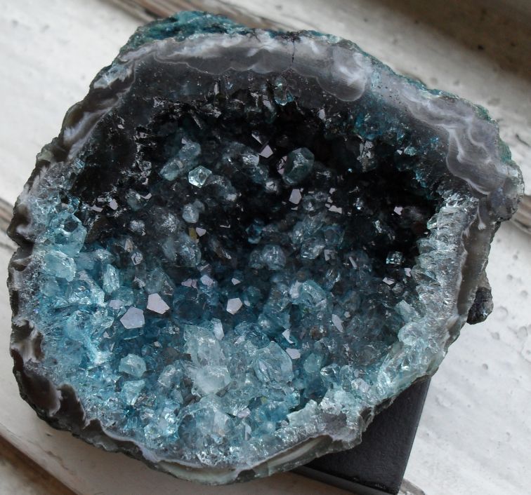 Hier im Gegensatz dazu meine Coelestin-Halbkugel. Das Blau ist ganz anders und die Kristalle sind schön groß