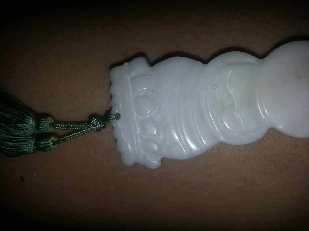 Die großen Amulette aus weissem(name unbekannt) Stein zeigen Kuan Yin,eine "göttin" des ostasiatischen Buddhismus`(eine sollte ursprünglich mal 12,90€ kosten,laut klebeetikett hintendrauf)