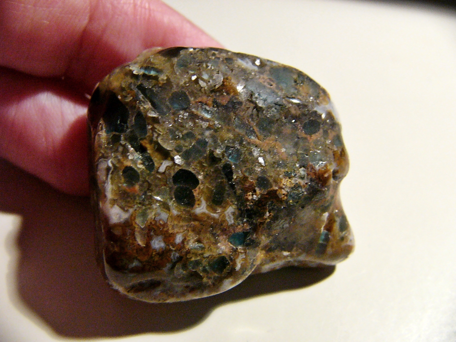 Nur ein Trommler sieht Interessant aus, unbekannt mit Grün - Rückseite wie Chalcedon ,Moosachat bitte um Hlfe was kann das sein.