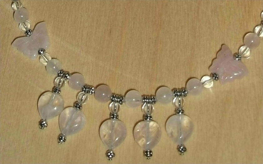 nochmal ein kleines Collier aus Bergkristallperlen und Rosenquarz in Perlen-, Schmetterlings- und Herzchenform