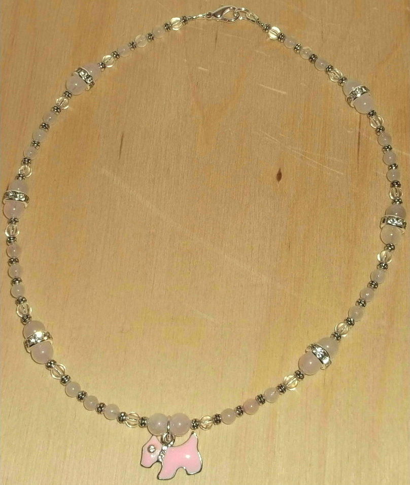 Und dann enstand gestern dieses Ketterl aus Rosenquarz, Bergkristall und Strassrondellen mit einem schnubbeligen Beschützer für kleine