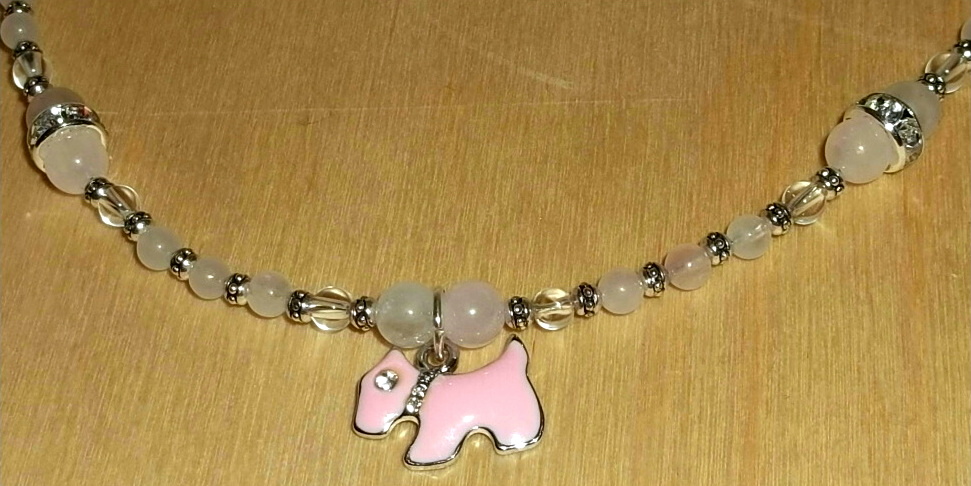 Und dann enstand gestern dieses Ketterl aus Rosenquarz, Bergkristall und Strassrondellen mit einem schnubbeligen Beschützer für kleine