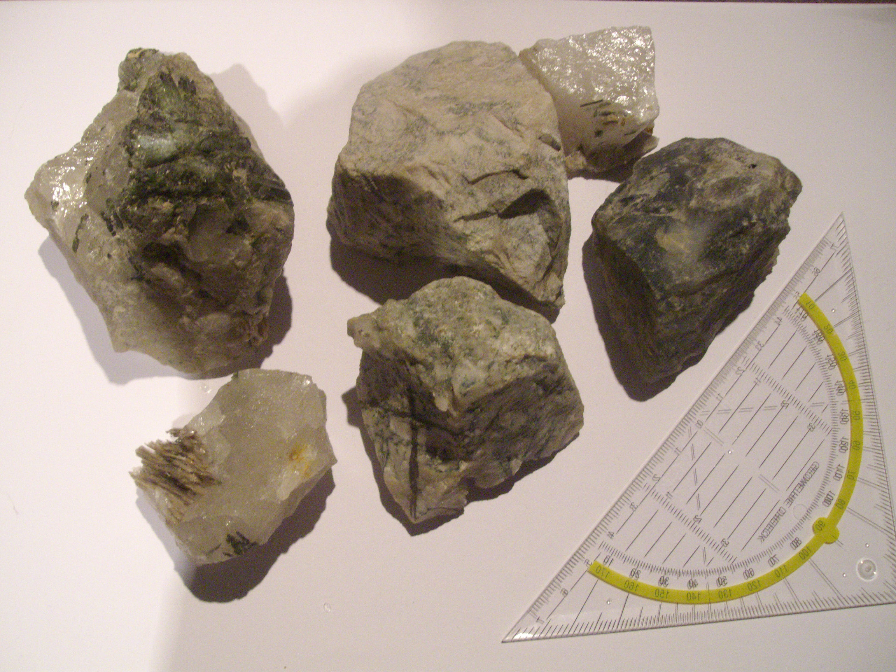 Als viertes wie der Titel schon sagt, weiß-durchsichtige Steine mit grünem Muster, roh.