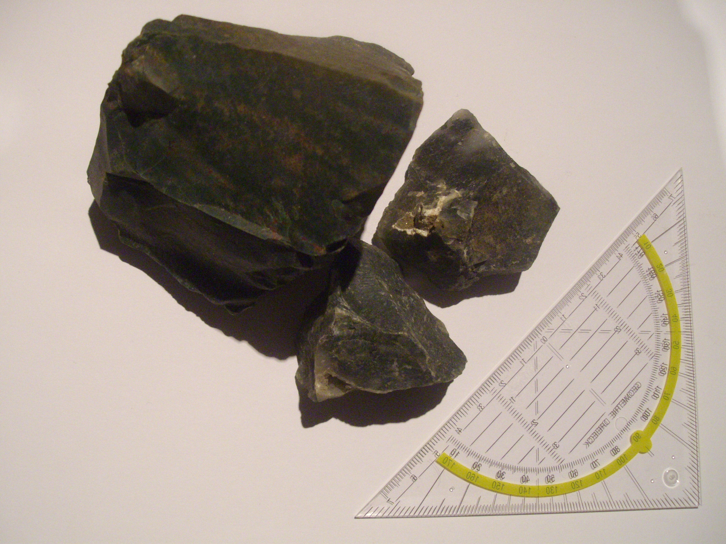 So, als erster, wie der Titel schon sagt, drei dunkelgrüne Steine, zusammen 660g, roh.