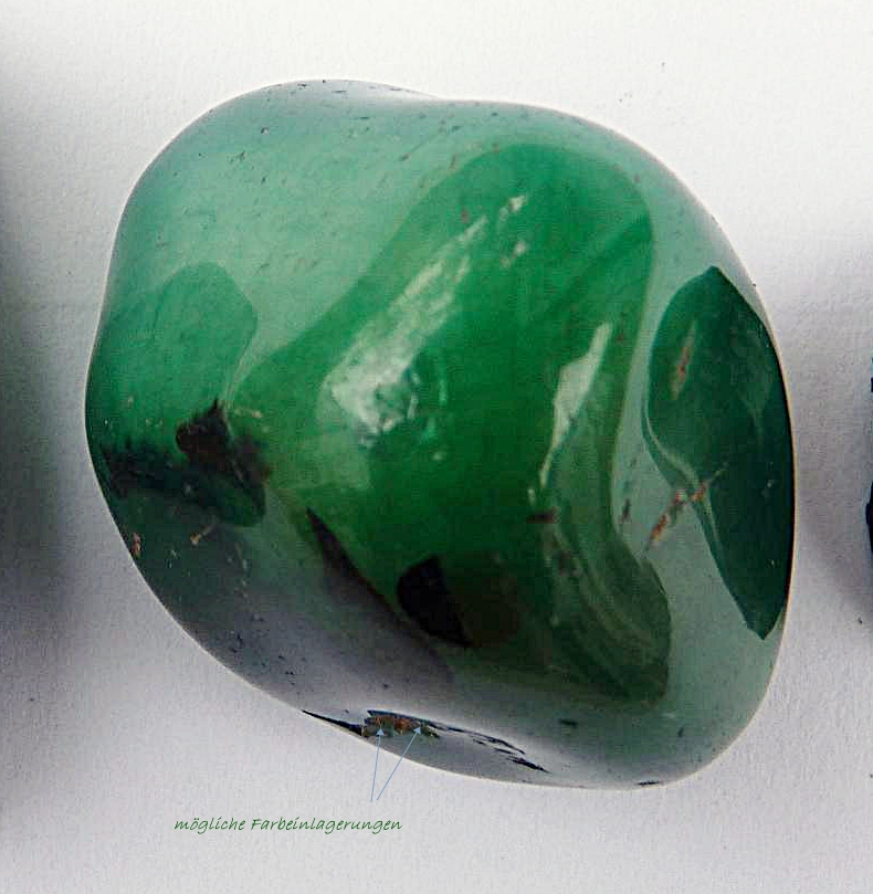 wobei ich dennoch zweifel hege, ob pranas trommelstein auch wirklich nephrit ist, da auch ich den eindruck habe, daß der stein gefärbt sein könnte......... in den vertiefungen, wo noch matrix zu sehen ist, scheinen sich farbablagerungen fest gesetzt zu haben. das wird man sicherlich am besten mittels einer starken lupe erkennen können.