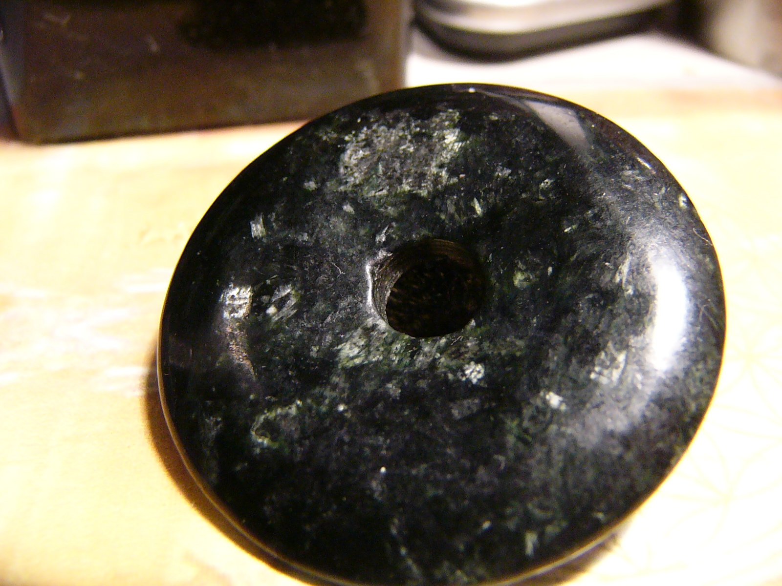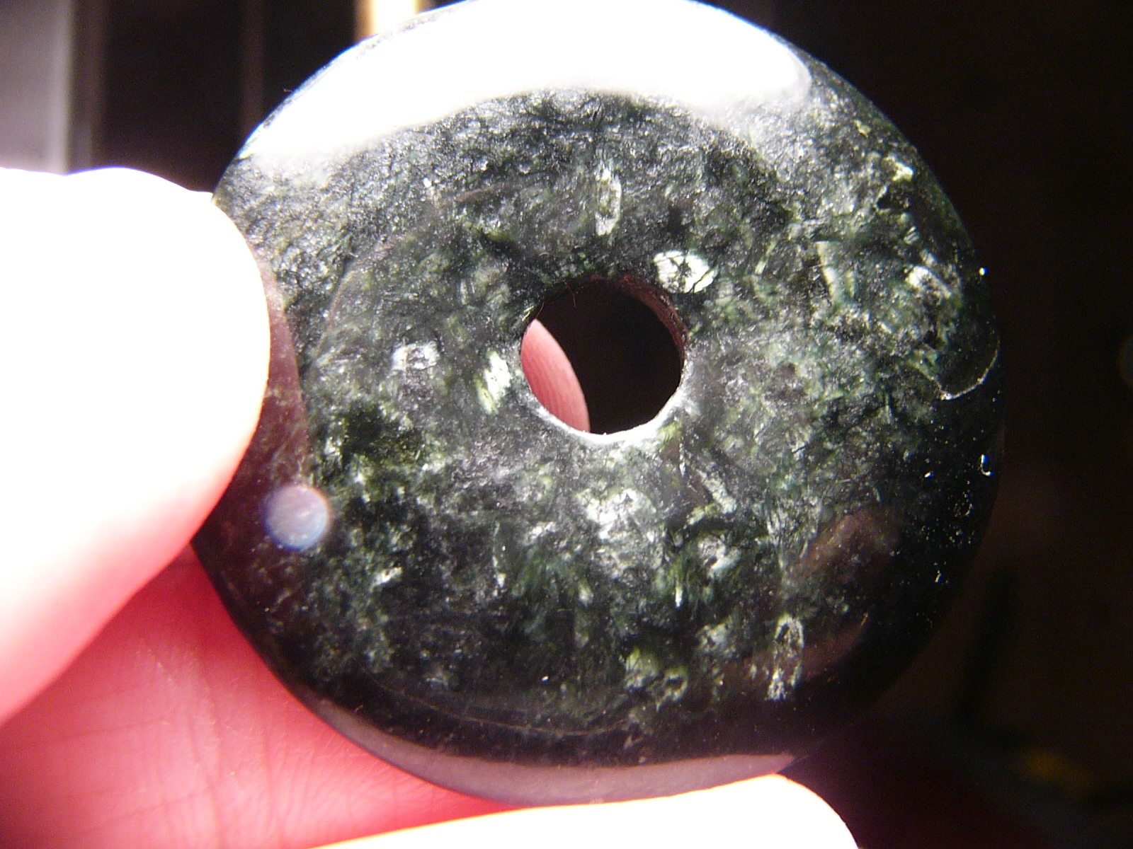 Obsidian habe ich auch ,die sind glatt wie Glas und schimmern bei der Bewegung im Licht ,dieser Donat faßt sich relativ weich an dagegen und das "Muster" ist immer sichtbar im Licht stärker die Oberfläche ist teilweise porig und matt sowie glänzend ,faßt sich irgenwie öhlig an.