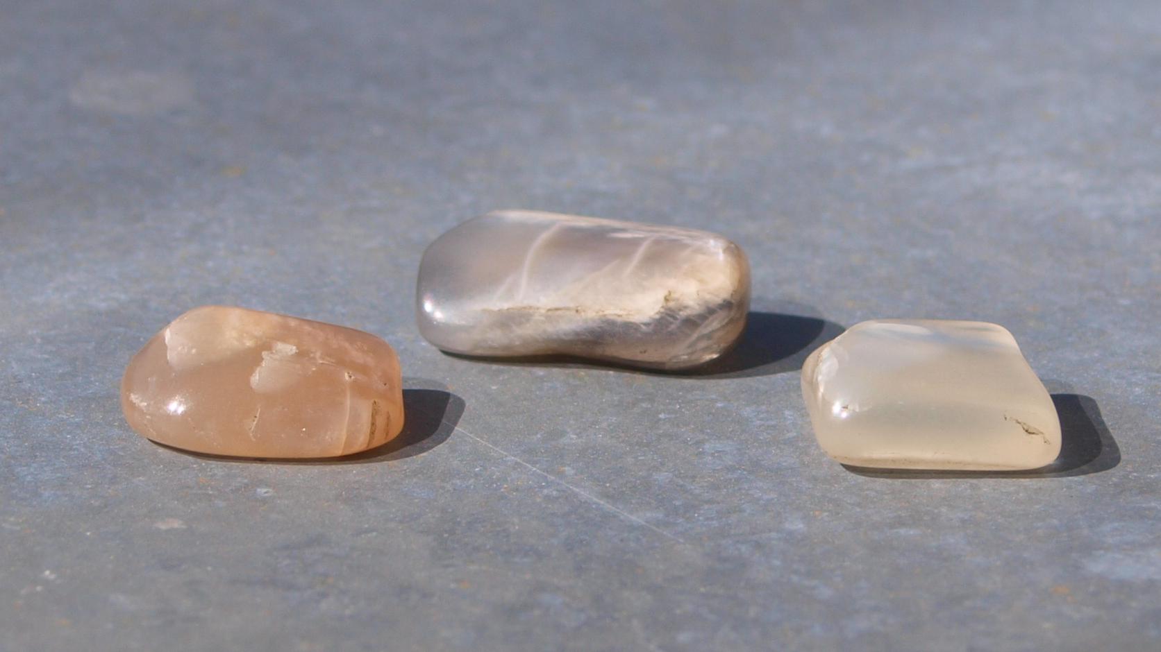 Es sind verschiedene Farbgebungen und der für Mondstein typische Schimmer zu sehen.