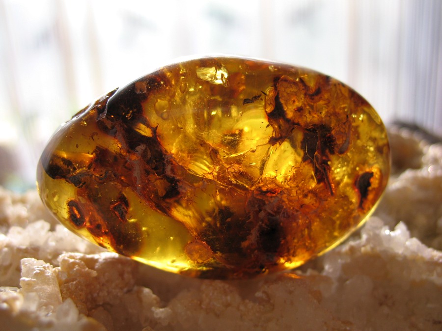 Der weiße Bernstein wird auch Königsbernstein genannt, denn er war in früheren Zeiten nur dem König vorbehalten. Die Farbe kommt von der Oxydation des Harzes mit anderen Baumsäften.