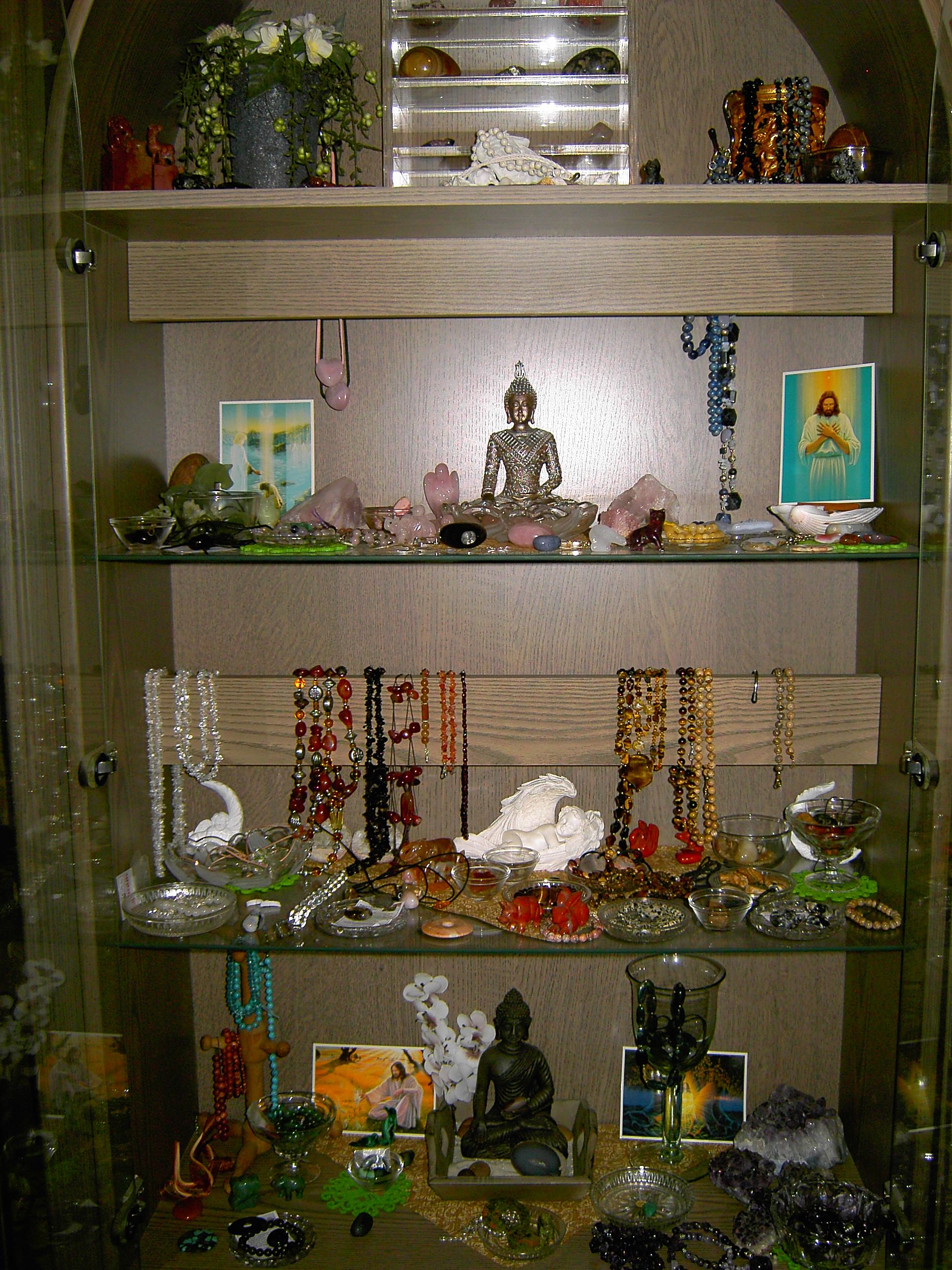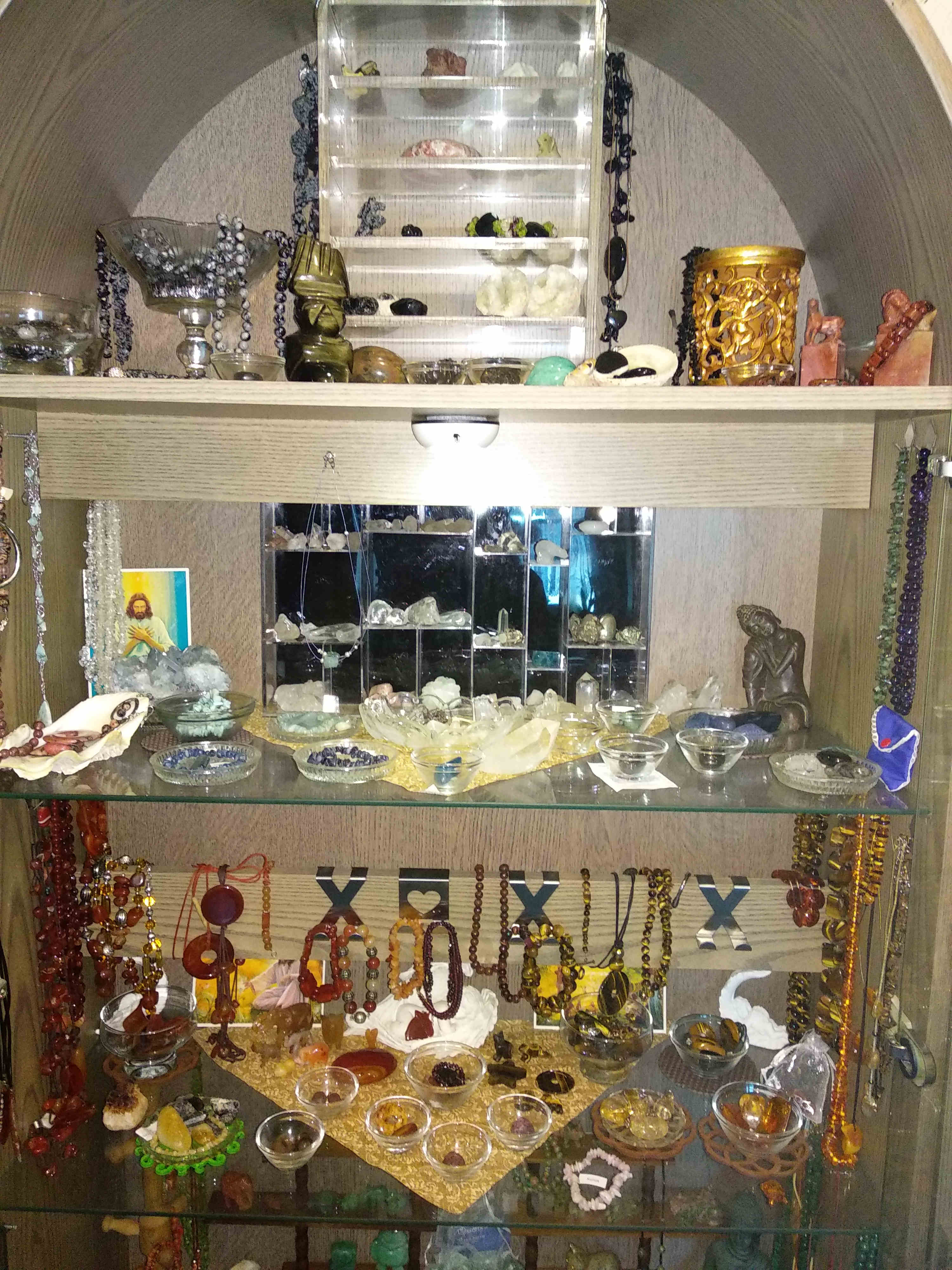 Ich habe noch nicht so eine große Auswahl. Vor allem ist es hauptsächlich Heilsteinschmuck. Also Ketten, Armbänder, Ohrringe, Anhänger in jeglicher Form etc. Trommler am liebsten relativ flach zum Auflegen und ein paar Tierfiguren. Mineralien sammle ich weniger und auch Rohsteine habe ich nur ein paar.