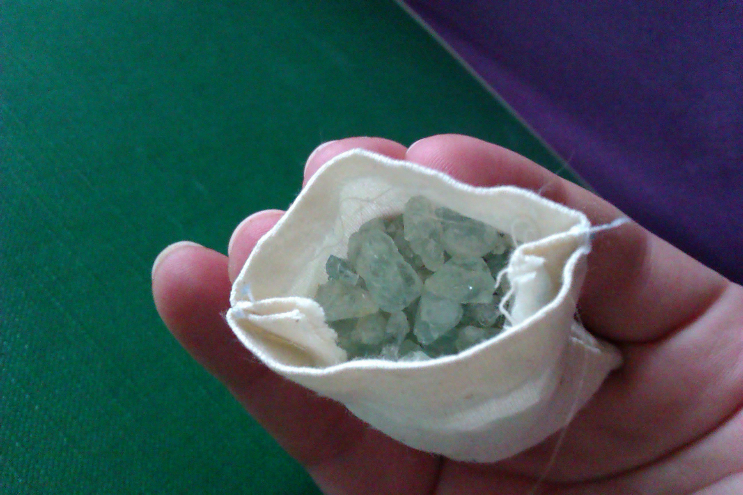 Da Aquamarin ja bei Augenproblemen helfen soll dachte ich mir ich nehme zwei Leinensäckchen und fülle sie mit den Kristallsplittern und verwende sie wie die Augenkissen die es zu kaufen gibt.