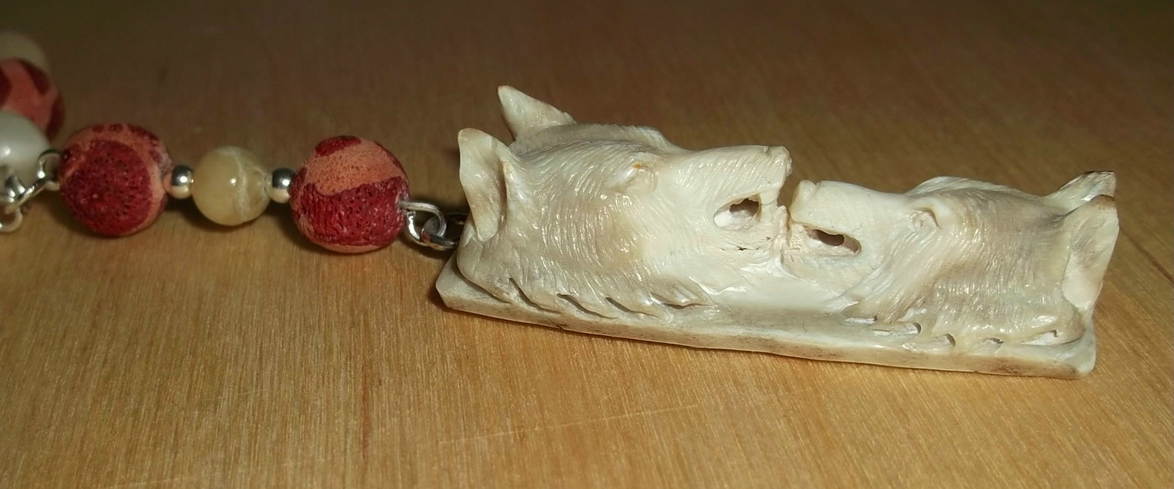 dann handgeschnitzte Wölfe aus Büffelknochen, für die Endloskette habe ich naturbelassene Koralle und helle Calcitperlen genommen