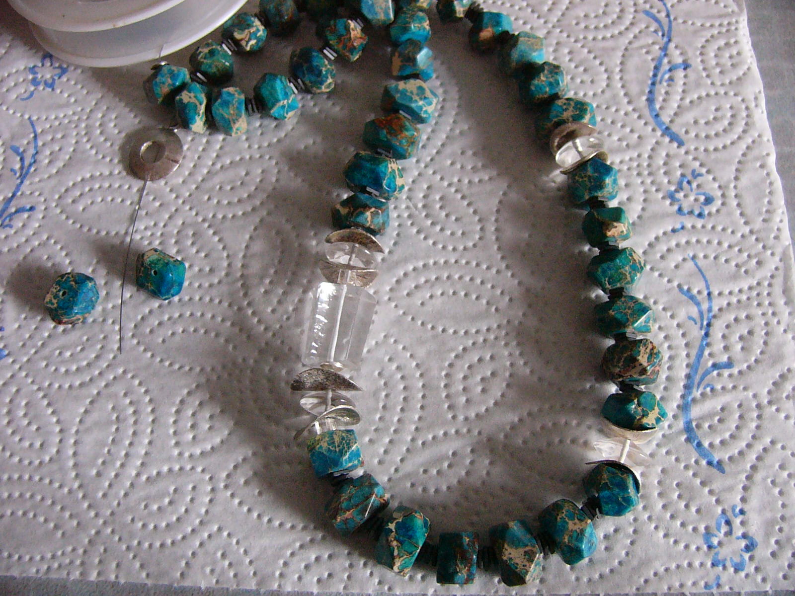 heute mal fast fertig gekettelt muß noch einen Verschluß haben.Meeressediment Jaspis ,kleine Pyrit quadratische Scheiben und Bergkristall Zwischenteile