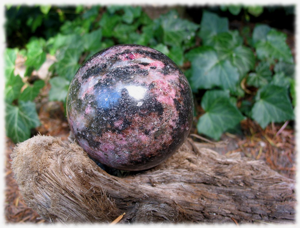 Die Rhodonit-Kugel leuchtet schön von innen heraus