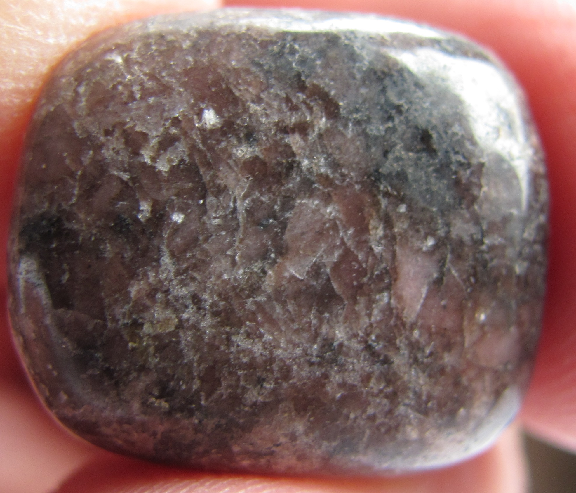 Könnte auch Rhodonit sein - das Foto ist einfach zu wenig aussagekräftig. Fotografier den Stein doch bitte noch einmal in anderem Licht, ohne Blitz und von etwas weiter weg.