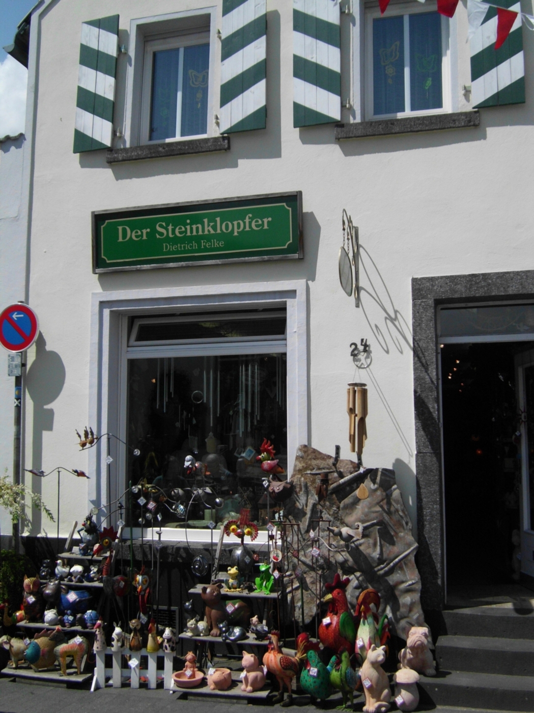 Alles sehr klein und fein dort, so auch der Steinklopfer! Außer Steinen gibt es dort noch Gartenfiguren (Blechtiere etc.) Postkarten, Salzsteinlampen, Steinbrunnen, Buddhas, Traumfänger und Mobilees.... Man kann, wenn man will, also einigen an Geld loswerden