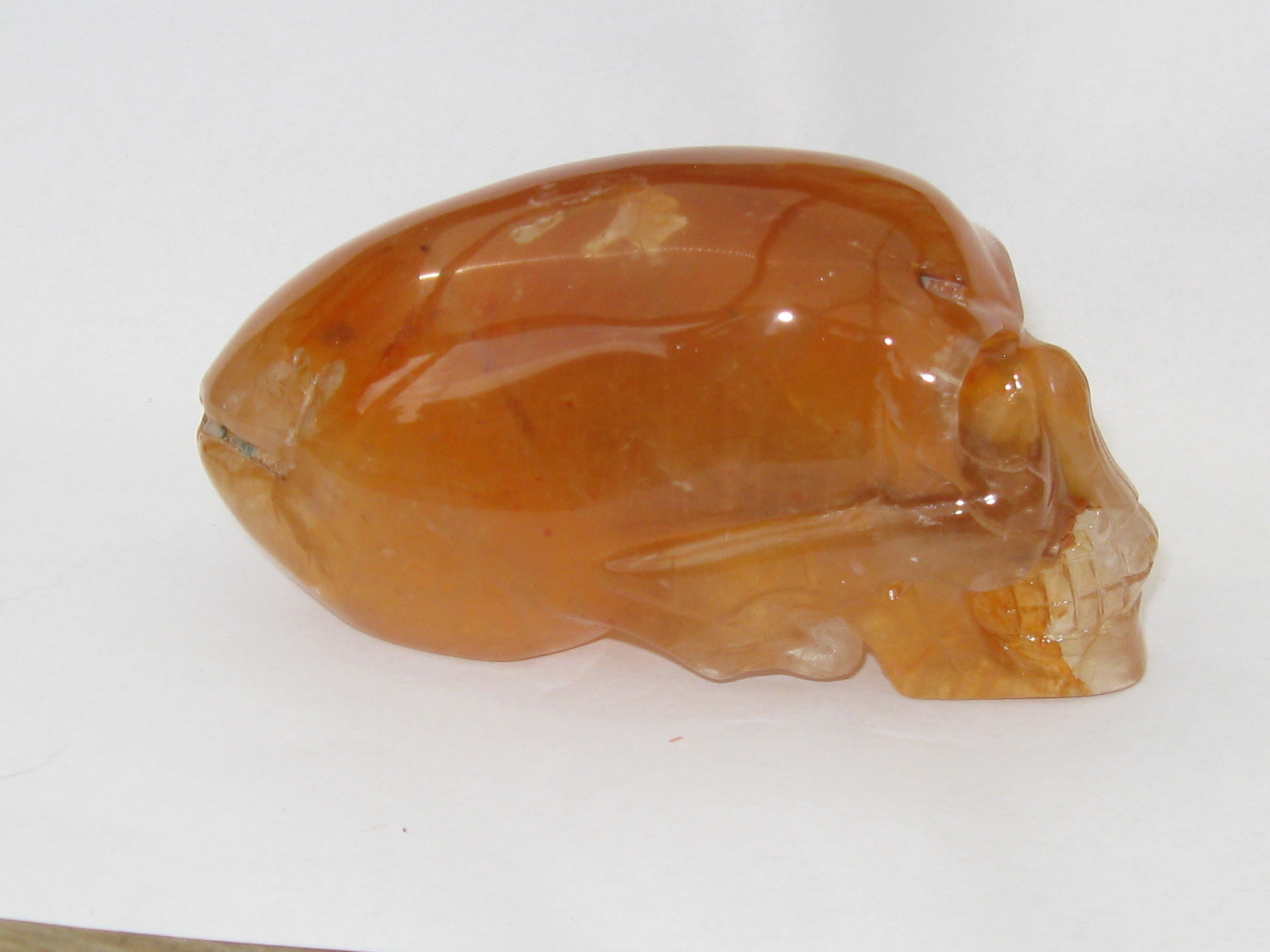 Hier ist ein travelerskull, ganz von orangenen golden healer, sie hat 2 große , ich denke, rutil nadel , im kopf gehabt, die aber wieder gans aufgelöst sind und jetzt nur tunnel nachgelassen haben. Sie ist stolze 10 cm lang, und liegt so toll in meine hand wenn ich schlafen gehen.