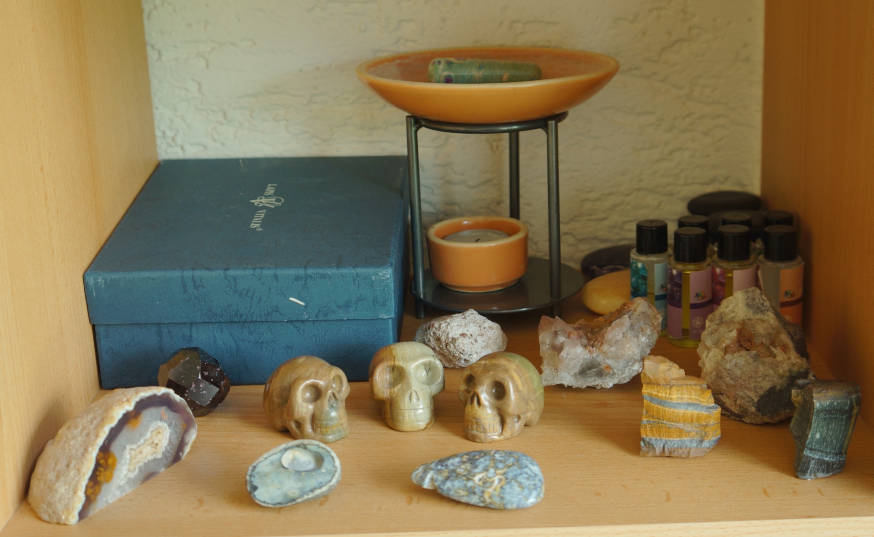 Utensilien für Steinmassagen (in der Schachtel Griffel und Kugeln, Edelsteinöle, und Teelicht für ätherische Öle)