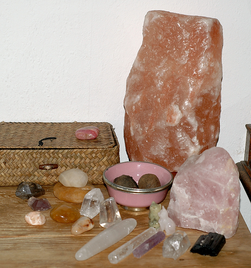 Ich habe einen mobilen Altar! Im Winter gönne ich mir ab und zu ein Bad. Dann richte ich mir meine Duftlampe ein (ich liebe die Essenzen der Atlaszeder und der Ylang Ylang Blüten), stelle 2, 3 meiner Steine auf den Badewannenrand und geniesse die Stimmung...