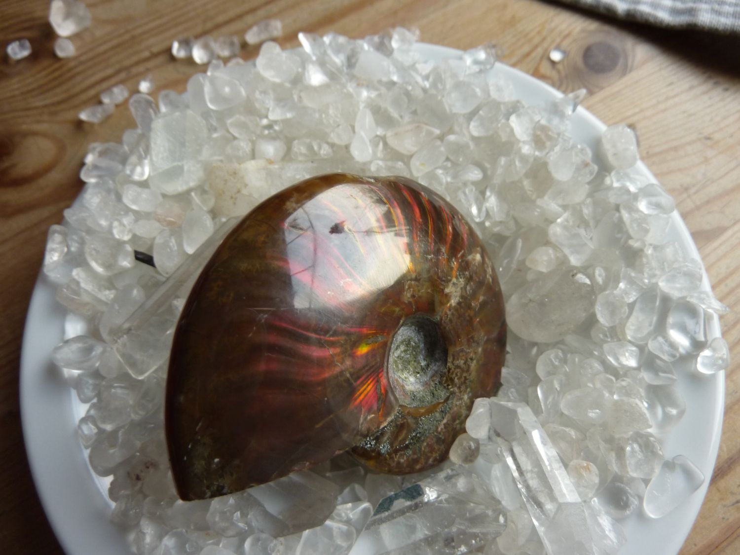 Die Freundin meiner Tochter hat einen toll rot schillernden Ammoniten ergattert. Leider hat mein Fotoaparat den richtigen Rotton nicht einfangen können