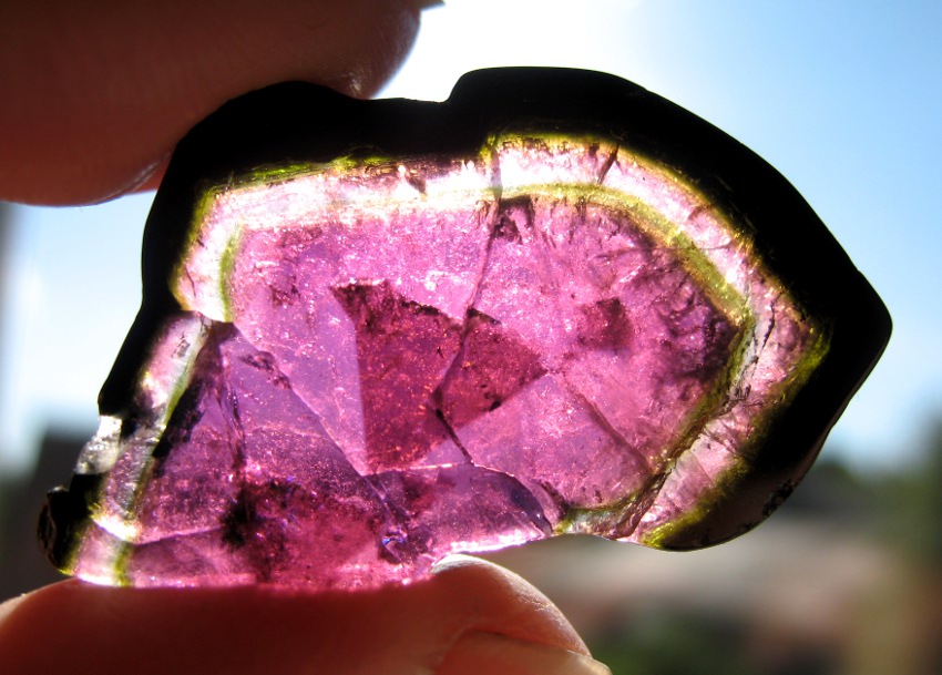 und eine wassermelonenturmalin-scheibe gegen sonnenlicht fotografiert