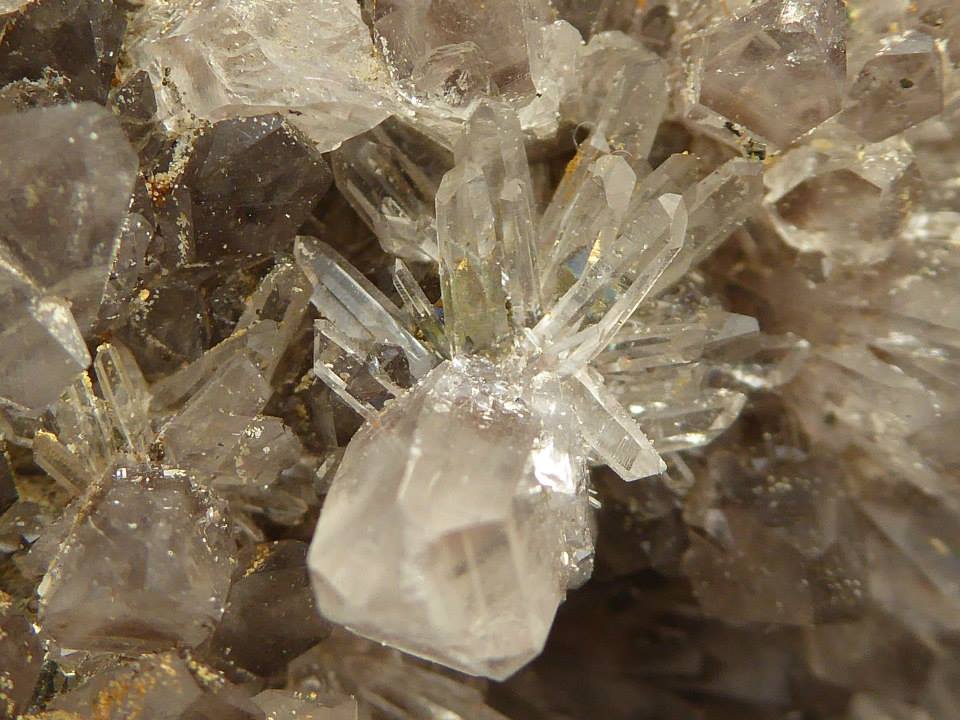 1.+.2. Generation von klaren und rauchigen Kristallen (scheint auch etwas Hämatit dabei zu sein) und kleine Doppelender und Pyrit oben drüber.
