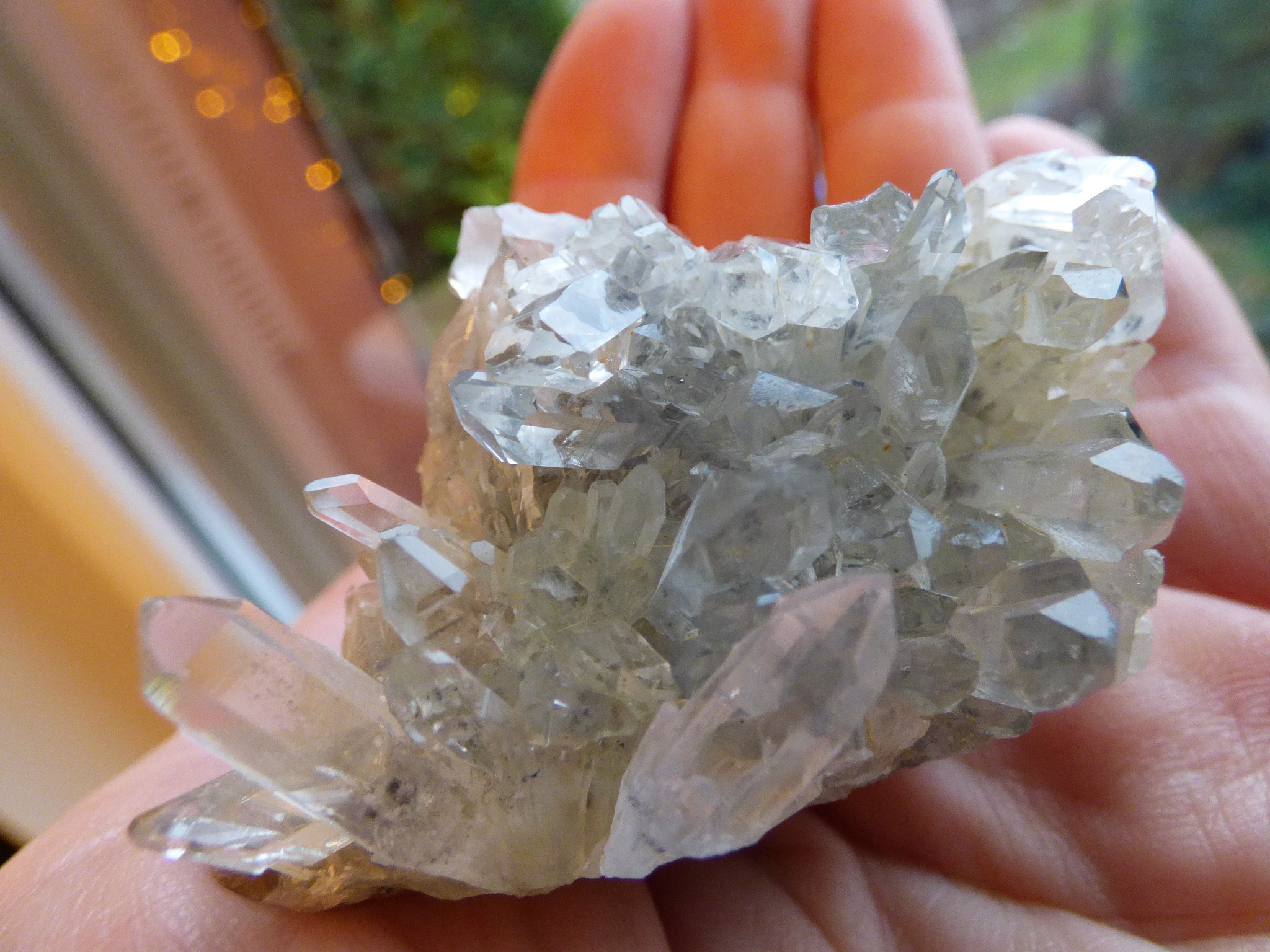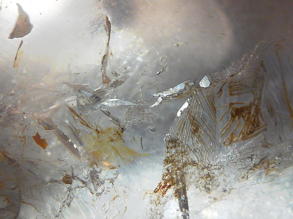 Ja und Rebana hat genau wie Shaham auch ein bisschen Limonit eingeschlossen und Hämatit. Und ganz witzige Strukturen in ihrem sehr klaren Kopf mit Gasbläschenschleiern.