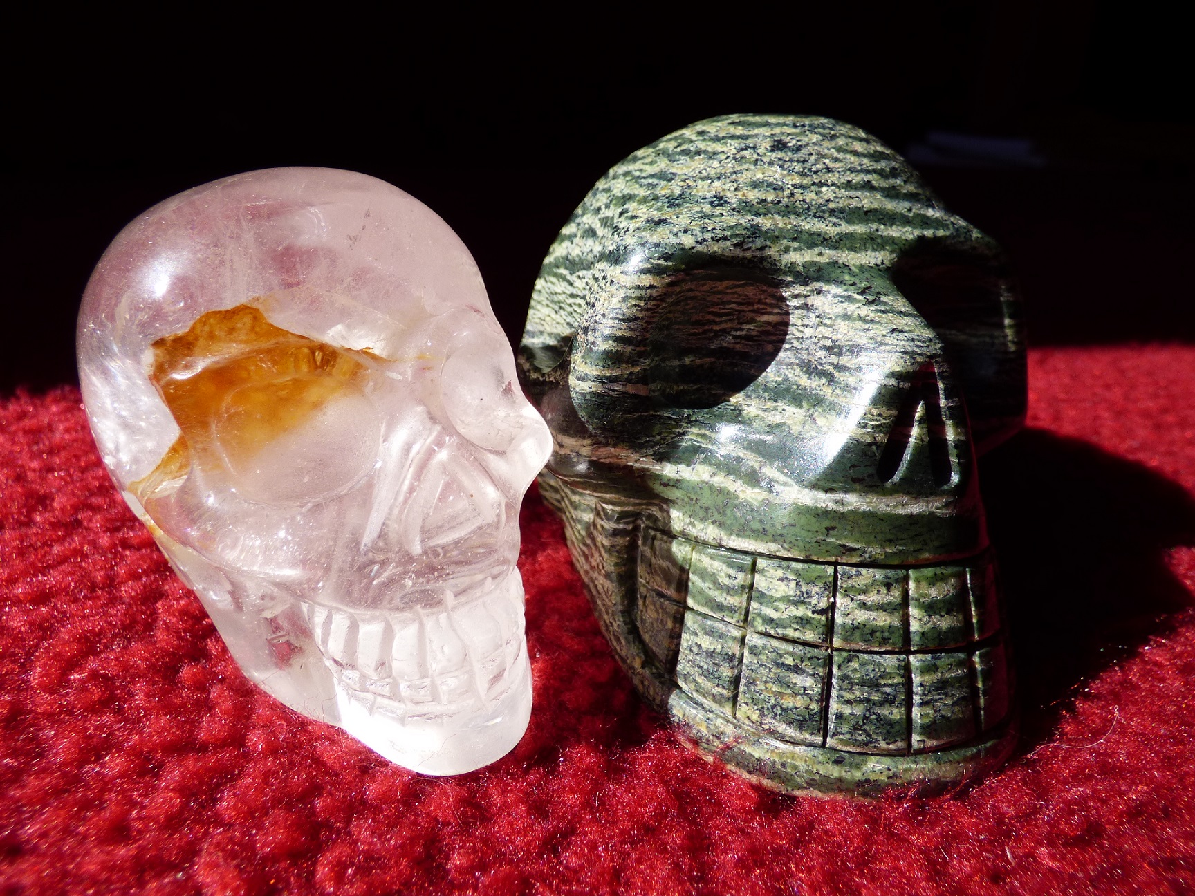 Ja ich höre da eigentlich immer auf die Schädel, wie sie aufgestellt werden möchten. Da kommen die unterschiedlichsten Formationen dabei raus, auch mit anderen Kristallen zusammen häufig. Jetzt passen sie leider nicht mehr auf den Tisch gg, aber bei schönem Wetter stelle ich sie auf dem Medizinrad draussen auf bei besonderen Gelegenheiten.