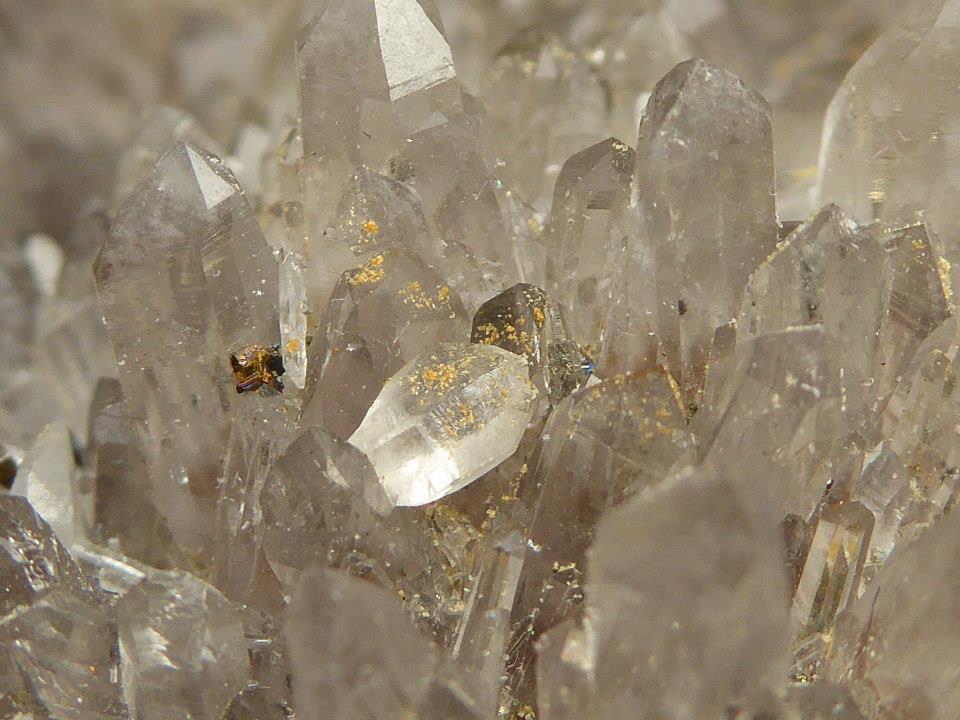 1.+.2. Generation von klaren und rauchigen Kristallen (scheint auch etwas Hämatit dabei zu sein) und kleine Doppelender und Pyrit oben drüber.